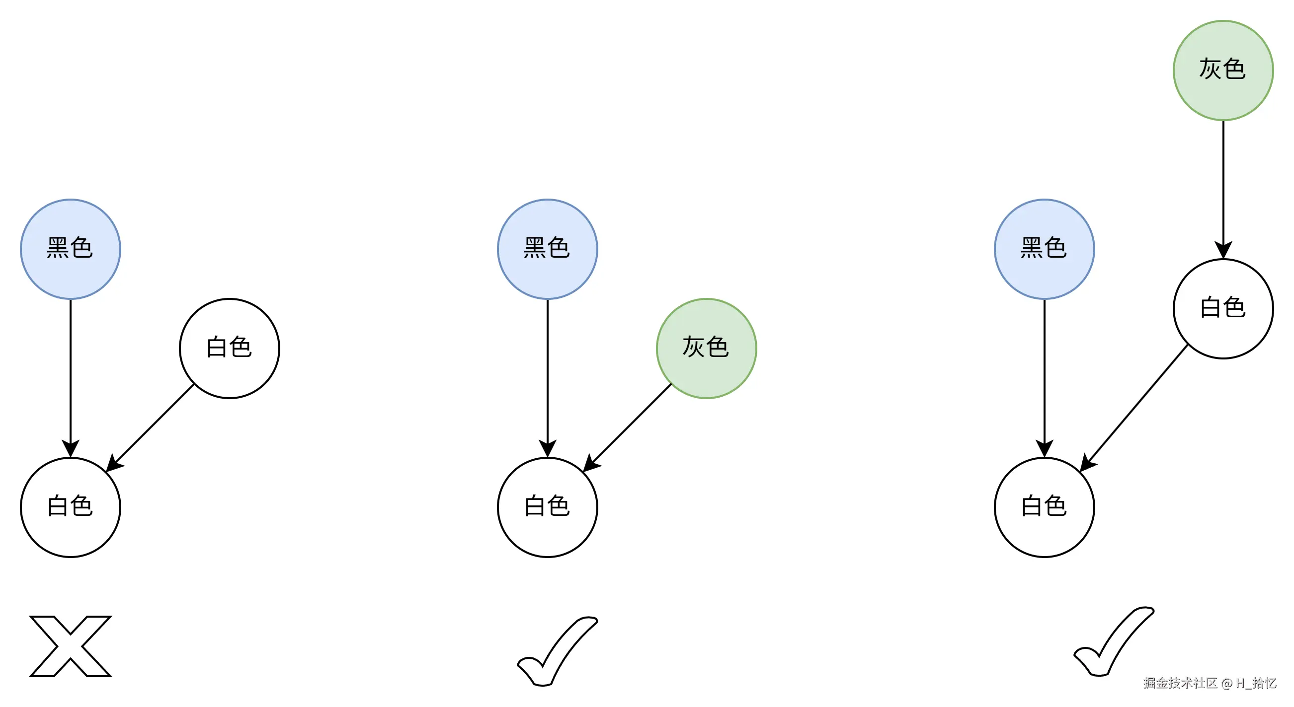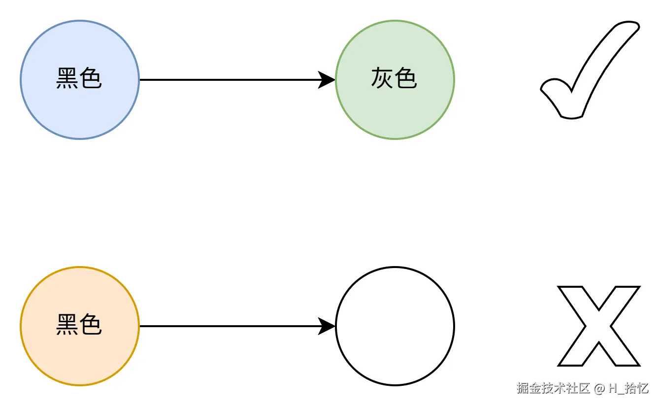 不存在黑色对象引用到白色对象的指针,如图所示.