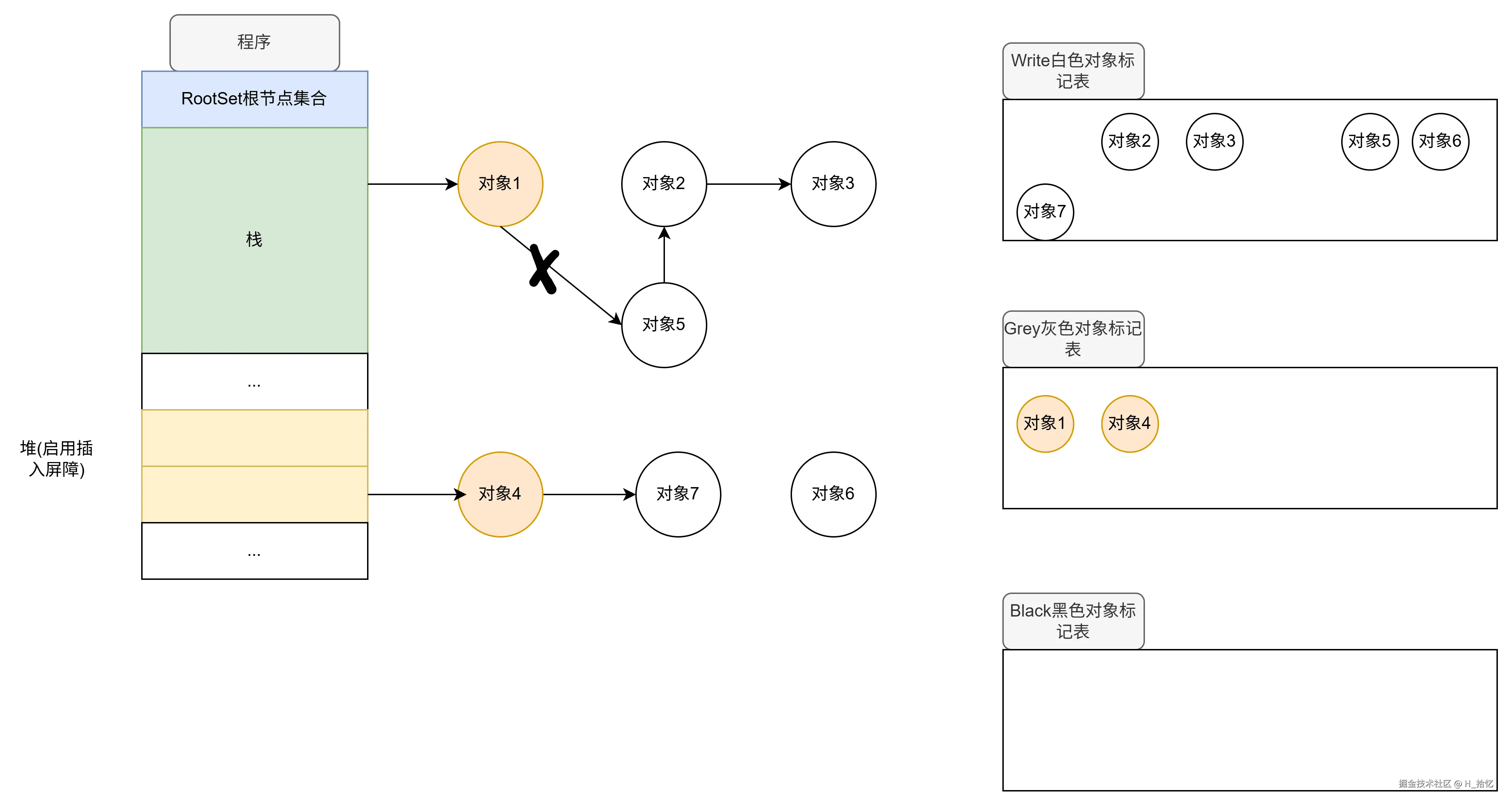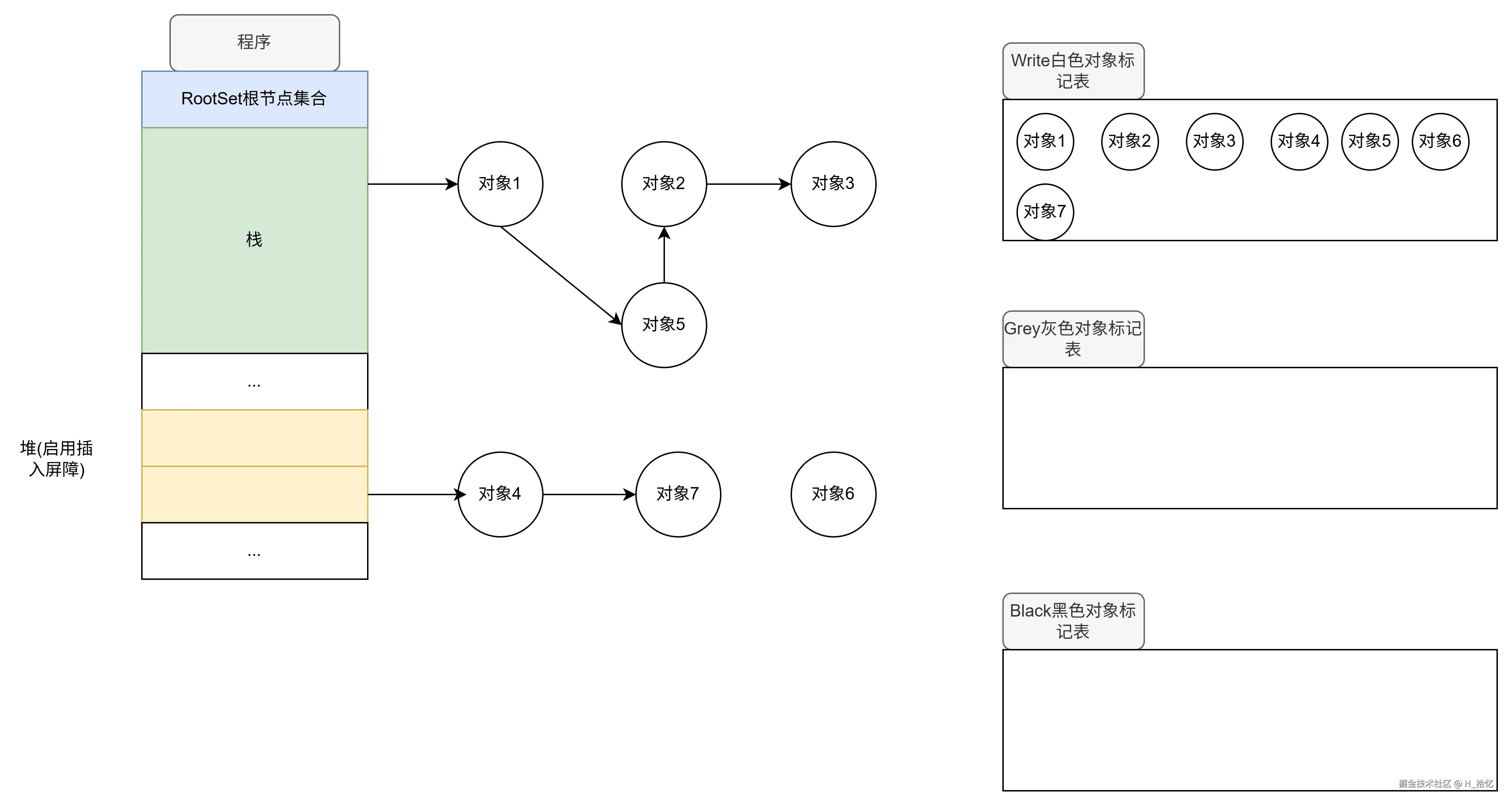 如图所示.在开始执行删除屏障的三色标记之前.目前的内存情况如下.在栈空间有对象1引用对象5 对象5引用对象2 对象2引用对象3.对象3没有下游对象.在堆空间有对象4引用对象7.对象7没有下游对象.没有对象引用的对象6.也没有下游对象.