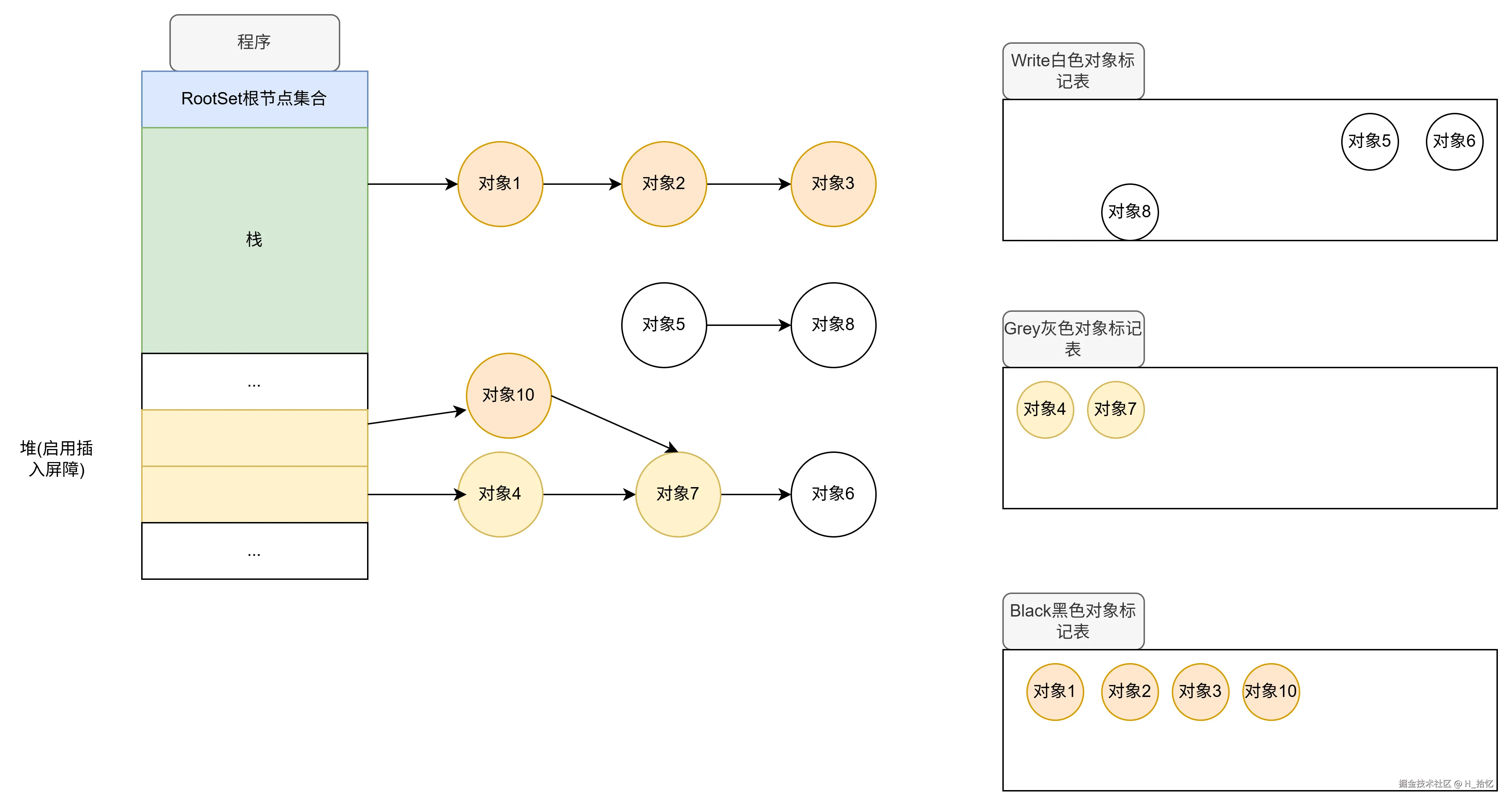原本白色的对象7已经成功的从一个堆对象4的下面转移到一个黑色的堆对象10下面.并且对象7及它的下游对象均被保护起来.整个过程中没有用到STW.