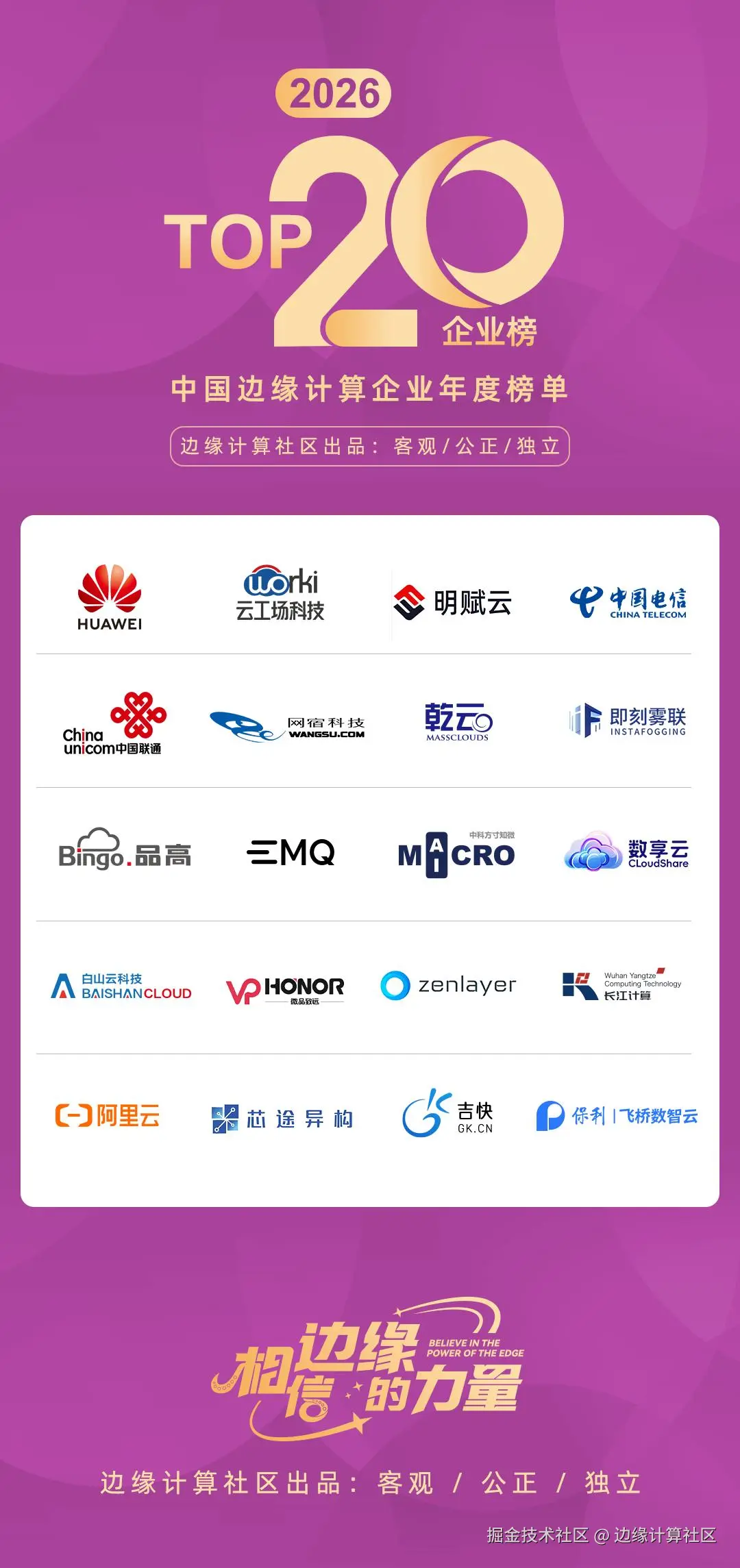 4月8日,边缘计算社区正式发布“2026中国边缘计算企业20强”榜单,长江计算凭借突出的算力技术与成熟的产业落地能力成功入选。作为国内算力领域权威行业评选,本次上榜充分彰显长江计算在算力基础设施领域的核心竞争力,是行业对公司长期深耕算力赛道、赋能数字经济发展的高度认可。