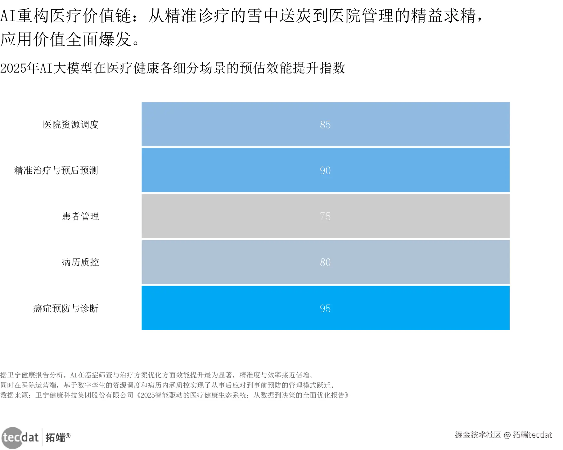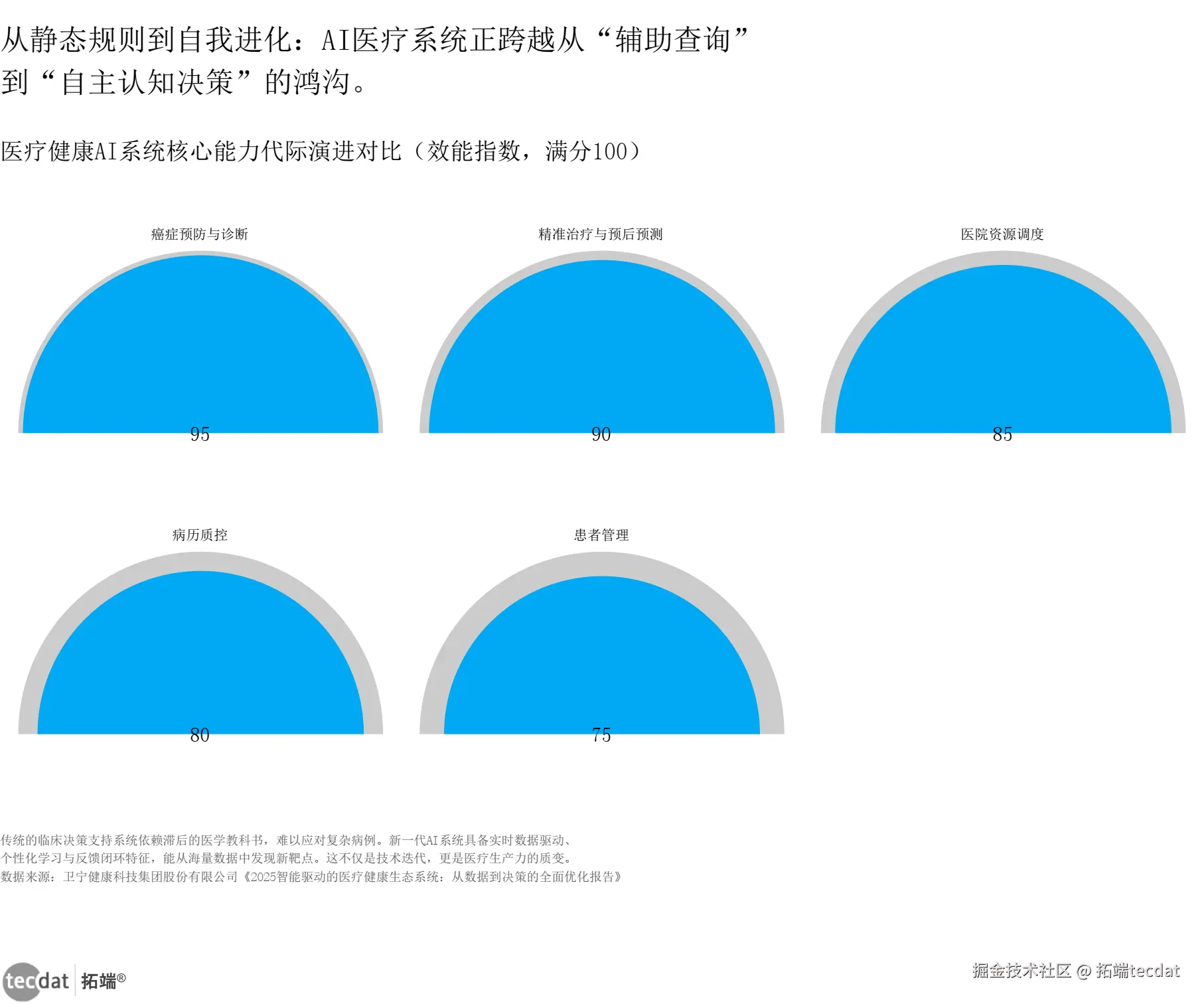 卫宁健康报告指出,新一代AI系统已进化为“自主认知决策系统”,在癌症筛查与治疗方案优化方面,效能提升指数接近95。