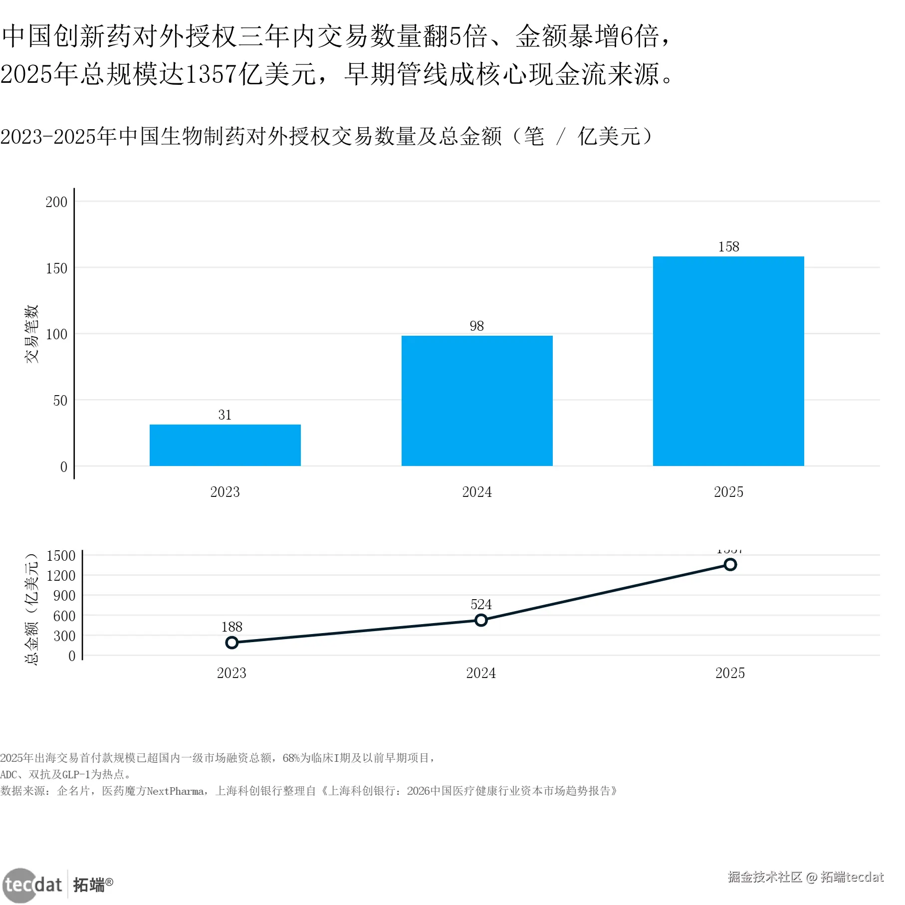 更值得关注的是,AI+医疗融资额从两年停滞的37亿跳升至139亿,英矽智能、联影智能等头部项目贡献主要增量。AI不再只是影像辅助的PPT故事,而是正在跨入“临床决策中枢”的价值跃迁期。创新药出海更是凶猛:2025年对外授权总规模达1357亿美元,首付款已超过国内一级市场融资总额,中国药企的早期管线正在全球定价体系内被重新锚定。