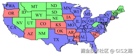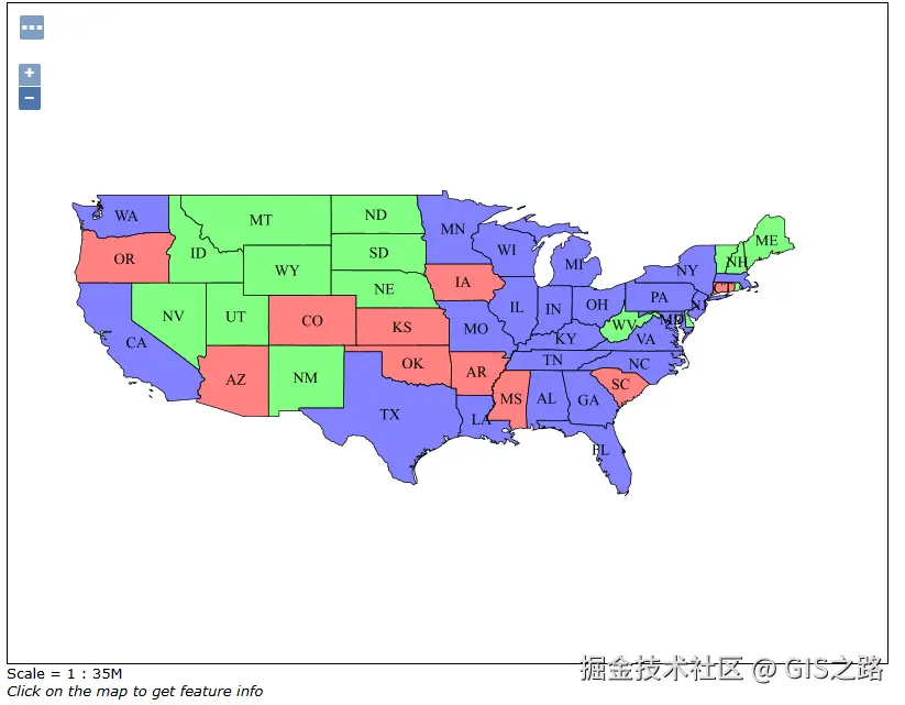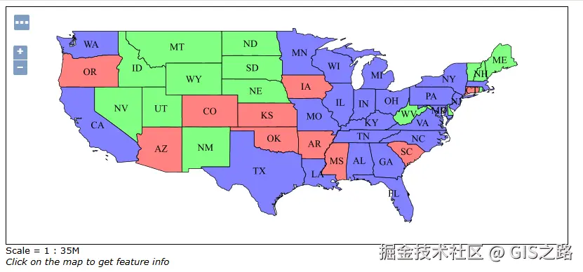 请求图层topp:states,它将返回默认样式(人口统计)、宽度(512像素)和高度(根据宽高比调整):