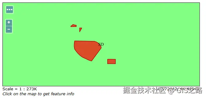 在上面的示例中,由于“sf:restricted”图层与美国地图相比非常小,因此很难被看到。为了让用户有机会获得更好的视图(如果他们选择这样做),我们可以返回一个OpenLayers应用程序。放大南达科他州(SD)以查看限制区域: