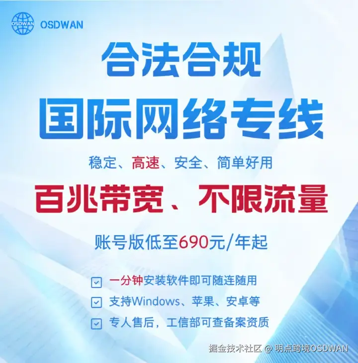 总的来说,OSDWAN兼具合规合法、稳定安全、简单易用、高性价比等优势,支持一键访问全球互联网。是企业办公、网络营销、跨境直播、社媒运营的不二之选。
