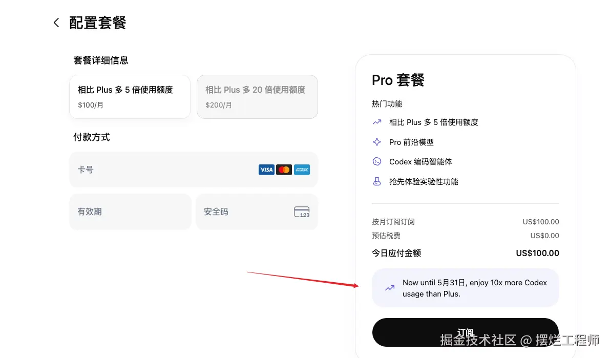 当你点击升级 Pro 会员时,官方是会给你选择的,可以选择 100刀 或者 200刀的 Pro 会员,在 5 月 31日之前 开通 Pro 5x 的话,目前是最划算的,因为他的 Codex 额度,跟之前的200刀差不多。