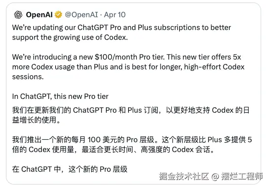 最近 OpenAI 终于把 GPT Pro 100 刀给上线了,前两个月就有报道会上线跟 Claude Max 一样的 Lite 套餐,也就是 Pro Lite 会员,价格是一半。