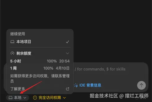 在编辑器上,可以通过左下方的本地按钮,点击后可以查看对应的额度。