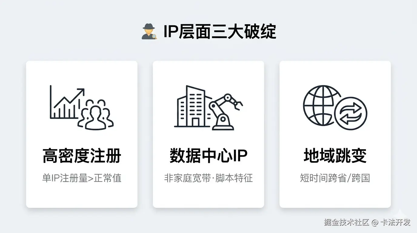 - 批量运行 → 必须使用云主机、虚拟化设备 IP多来自数据中心(IDC) 而非家庭宽带。识别网络类型即可区分真人与机器。