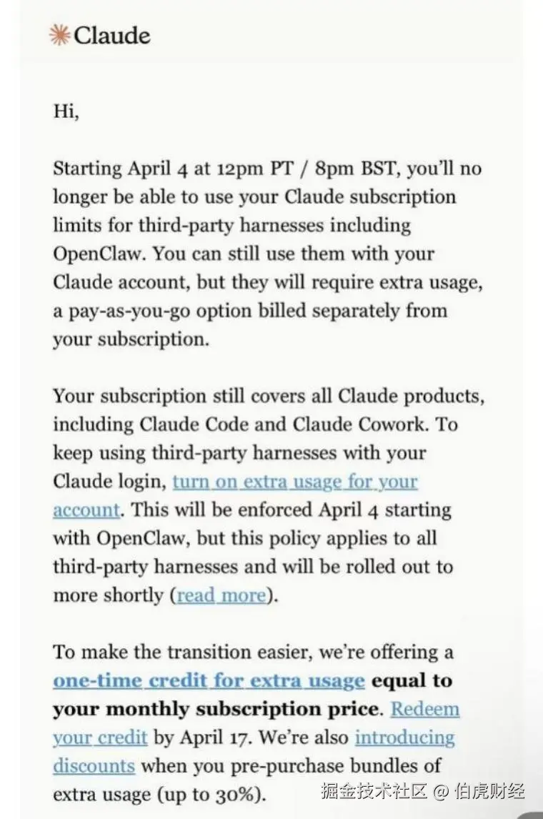 几天前,Anthropic向所有用户发送邮件,宣布自当地时间4月4日下午3点起,Claude Pro和Max订阅将不再覆盖OpenClaw等第三方工具的使用。