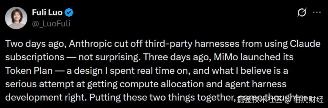 几天之前,Anthropic突然宣布切断第三方工具对Claude订阅的访问权限,这也是罗福莉发文讨论Token定价逻辑的契机。