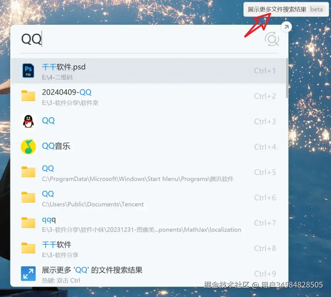 很多人都知道它的文件搜索功能,双击「Ctrl」就能一键唤出软件,输入关键字即可秒启动对应程序,比如输入 QQ 就能直接打开!