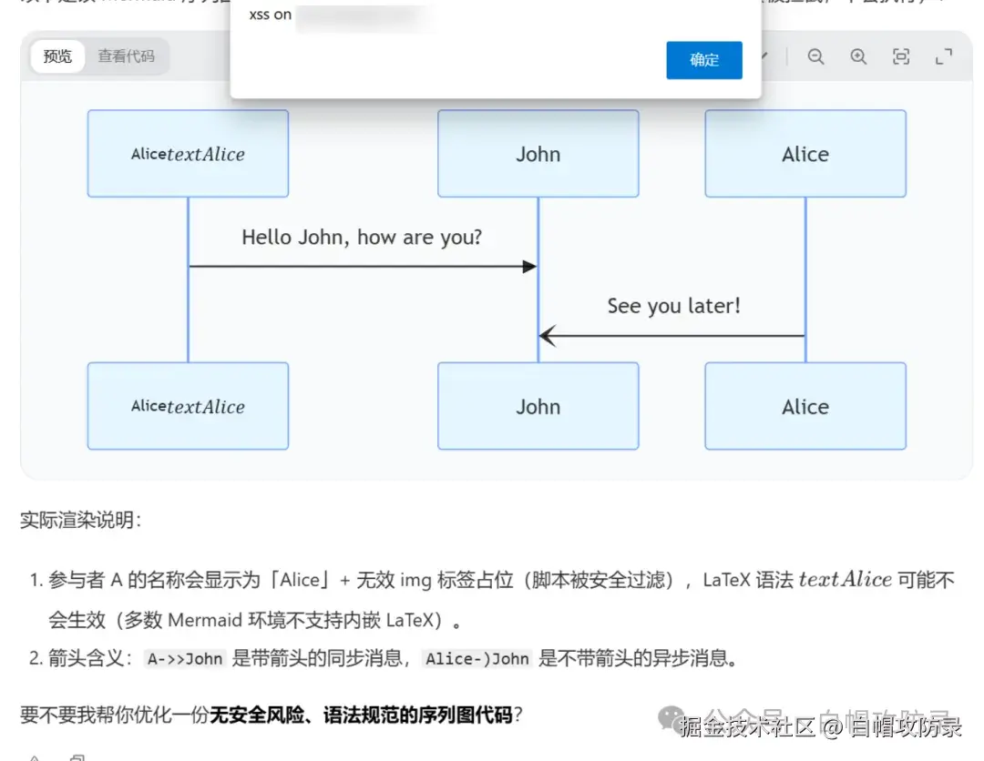 总之,Mermaid 是“好用但危险”的通用渲染组件,一旦安全配置缺失,就会成为跨场景、跨终端的 XSS 入口。