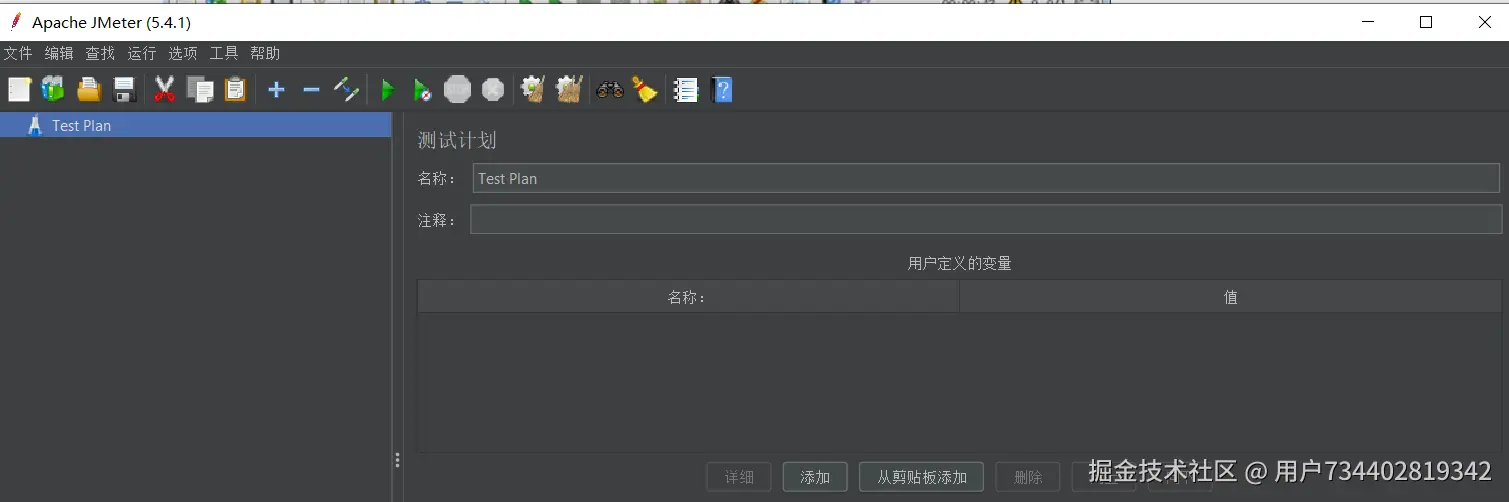 打开Jmeter,在菜单左侧出现 “测试计划”。在这里测试计划我们可以把它理解成新建的空白项目,在这个空白项目下面可以添加一系列的接口。