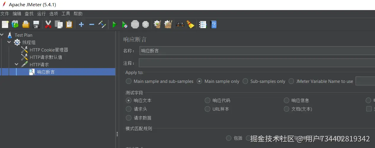 指断言作用范围,通常发出一个请求只触发一个请求,所以勾选“main sample only”就可以;若发一个请求可以触发多个服务器请求,就有main sample 和sub-sample之分了。