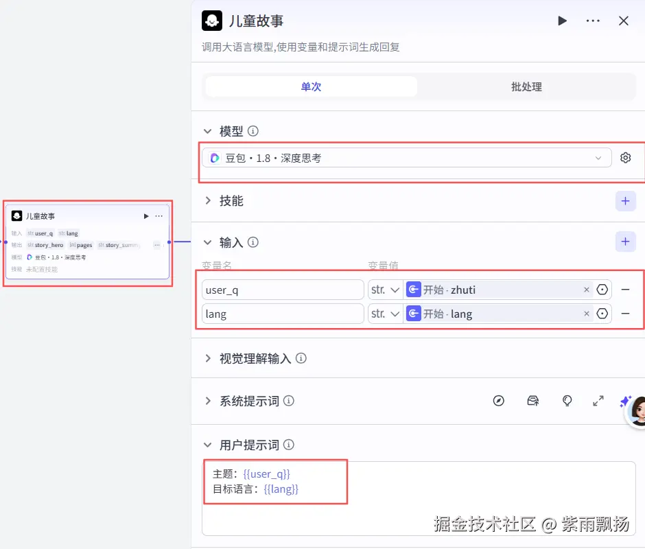 在开始节点后面添加一个扣子官方的 【大模型】 节点->重命名为儿童故事->设置参数及提示词