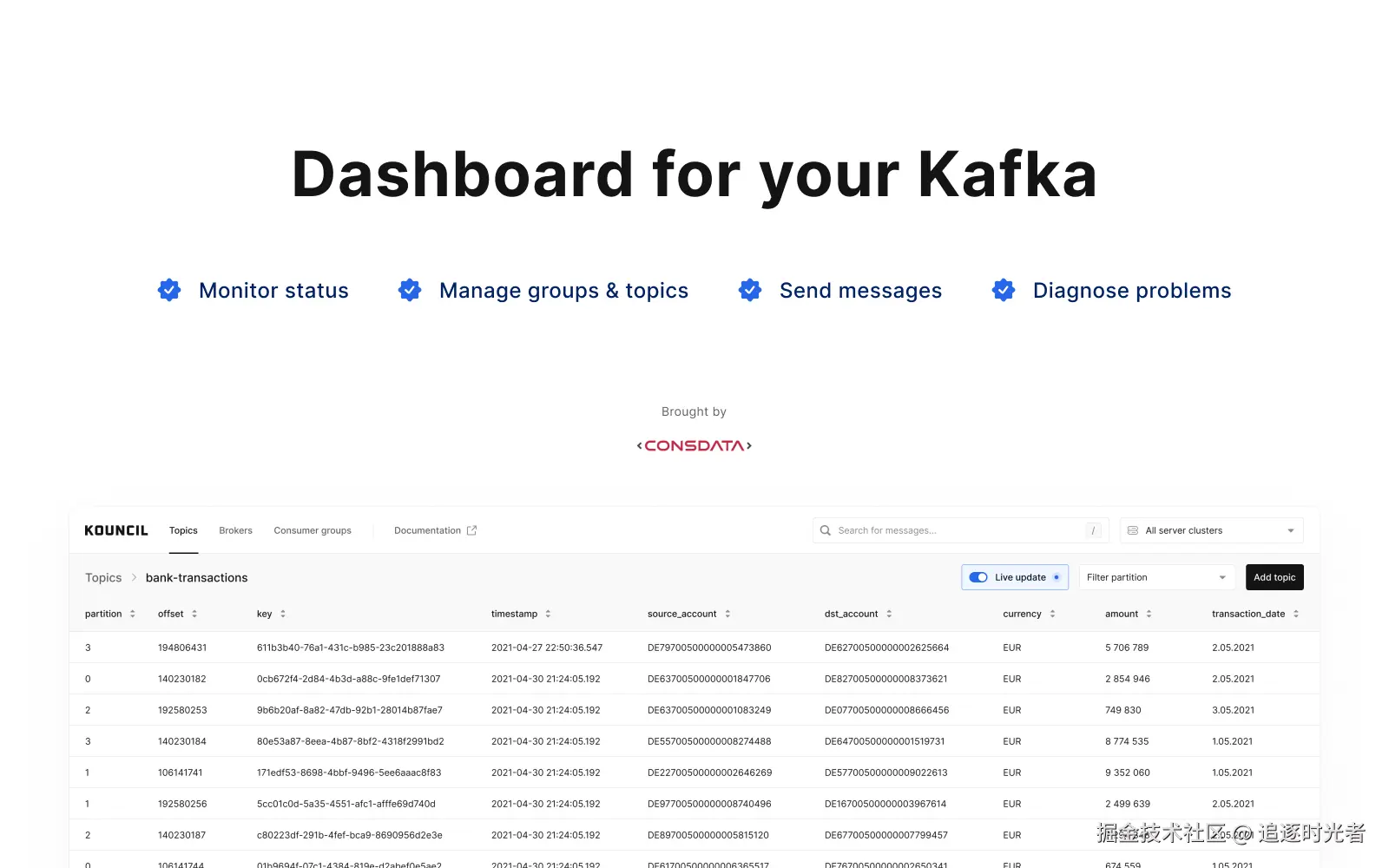 Kouncil 是一款现代化的 Web 界面工具,可让你监控和管理 Apache Kafka 集群。它是一款免费、开源(GPL-3.0 license)的 Kafka Web UI,功能丰富且易于设置!这款简洁的 Kafka 工具可让您的数据清晰可见,帮助你排查问题并提供最佳解决方案。你可以轻松监控代理及其状态、消费者组及其速度以及当前延迟,或者直接实时查看主题内容。