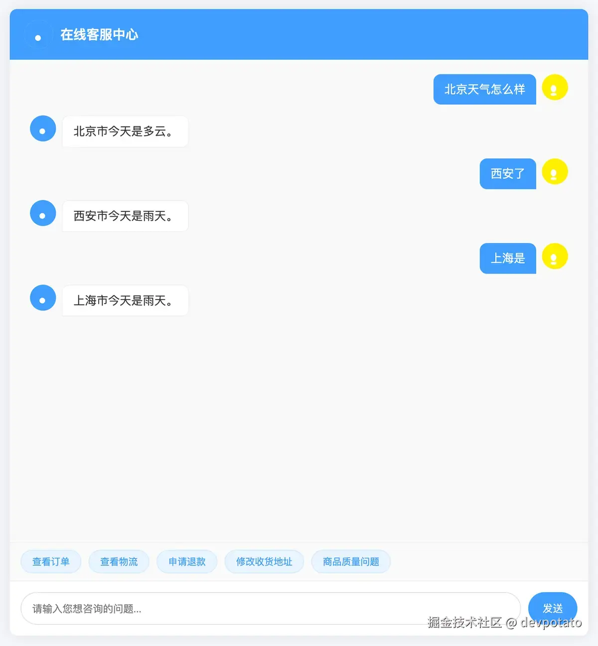 - 用户的原始问题(如“北京今天天气怎么样?”)