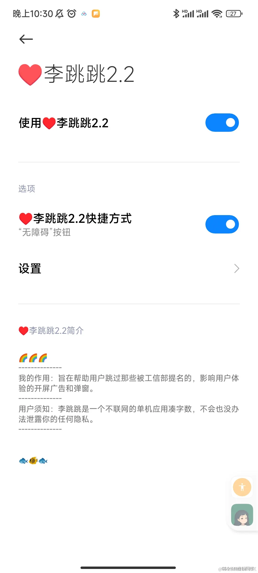 目前测试下来,李跳跳2.2版本能稳定运行,较新的2.6版本反而在安卓机上开启不了无障碍功能,推荐大家使用2.2版本,获取地址:(无任何套路,可直接下载安装包)