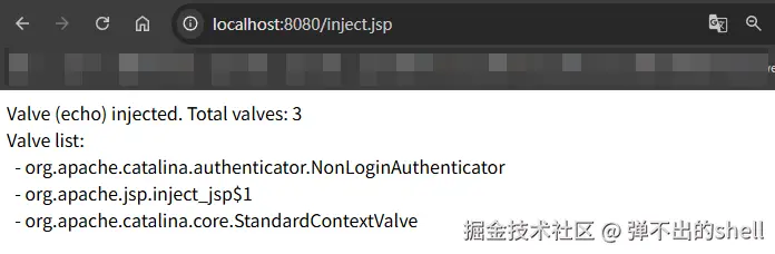 访问 http://localhost:8080/inject.jsp,可以看到注入成功,列出了当前 Pipeline 中所有的 Valve:
