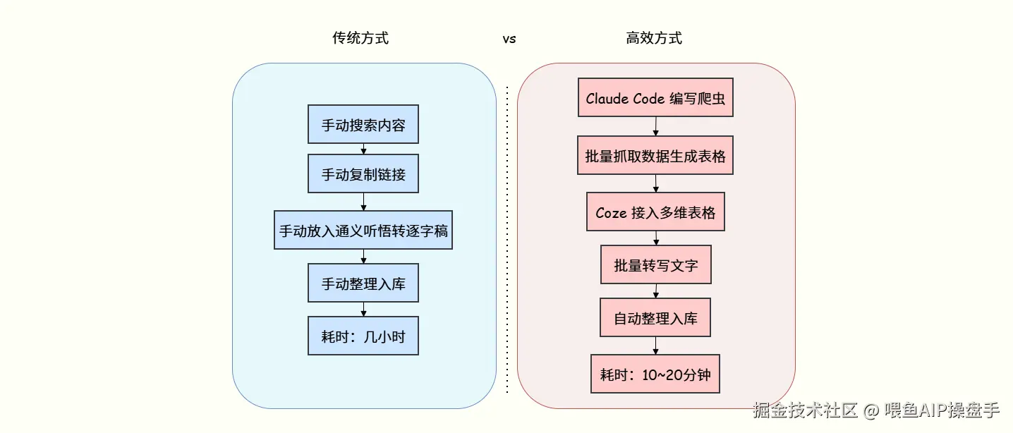 有些组用传统方式——手动搜、搜了后手动复制链接、手动放入通义听悟转逐字稿、手动入库,整体几小时