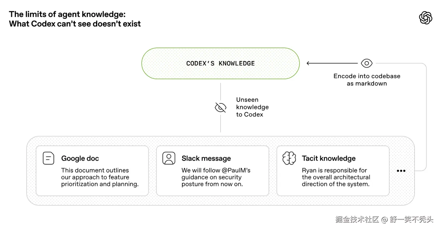 正确上下文供给:上下文是稀缺资源,不是越多越好。OpenAI 强调要把知识变成结构化、版本化的 repo 文档(AGENTS.md + docs/ 目录),而不是散落在 Slack/Google Doc 里。