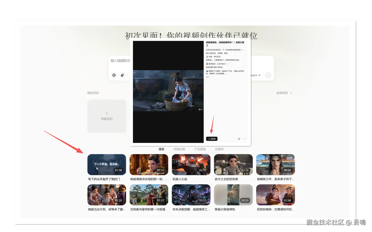 视频创作这部分还有一些做好的项目案例,点击查看详情,还能看到像某音类型的“做同款”功能。