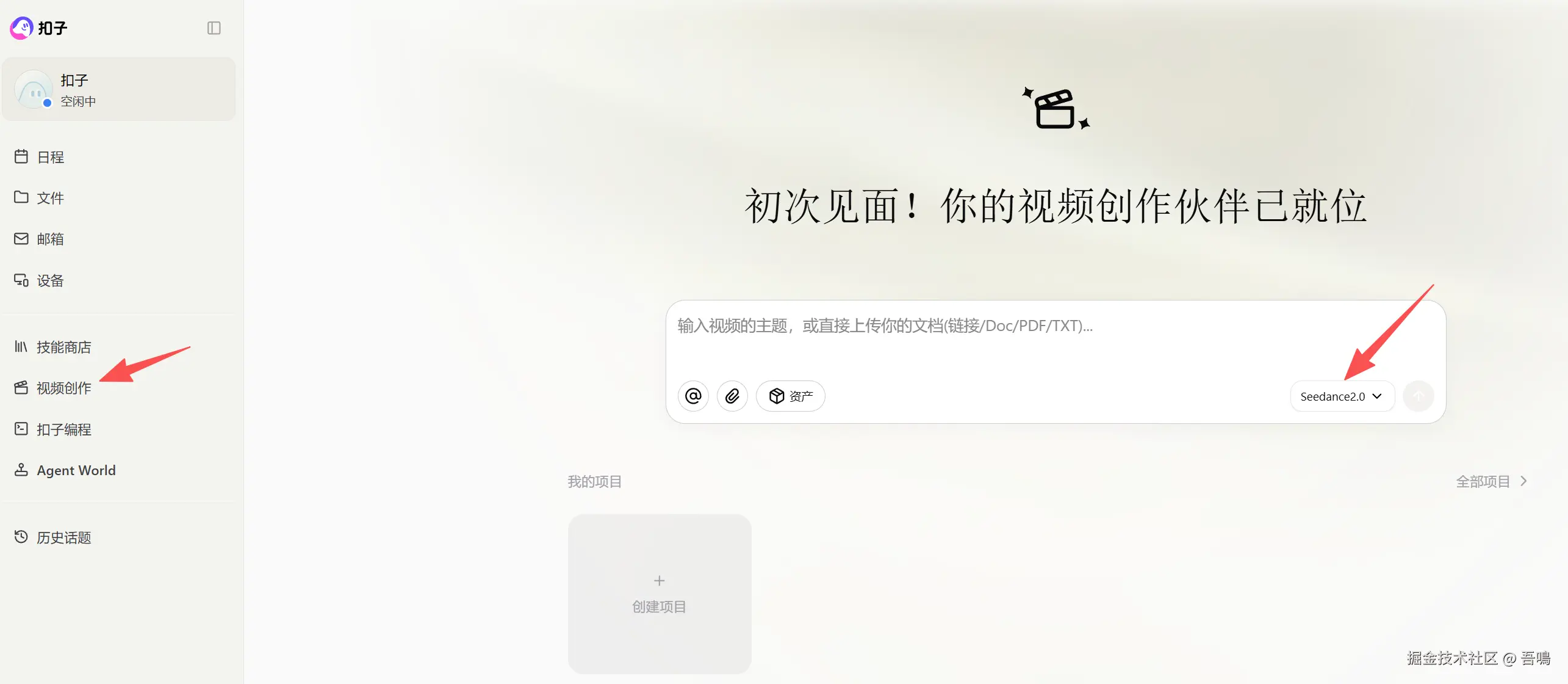 怎么样才能够使用上满血版的Seedance2.0?只需要在扣子左侧的菜单栏中,点击“视频创作”菜单,便可以进入到视频创作的页面。