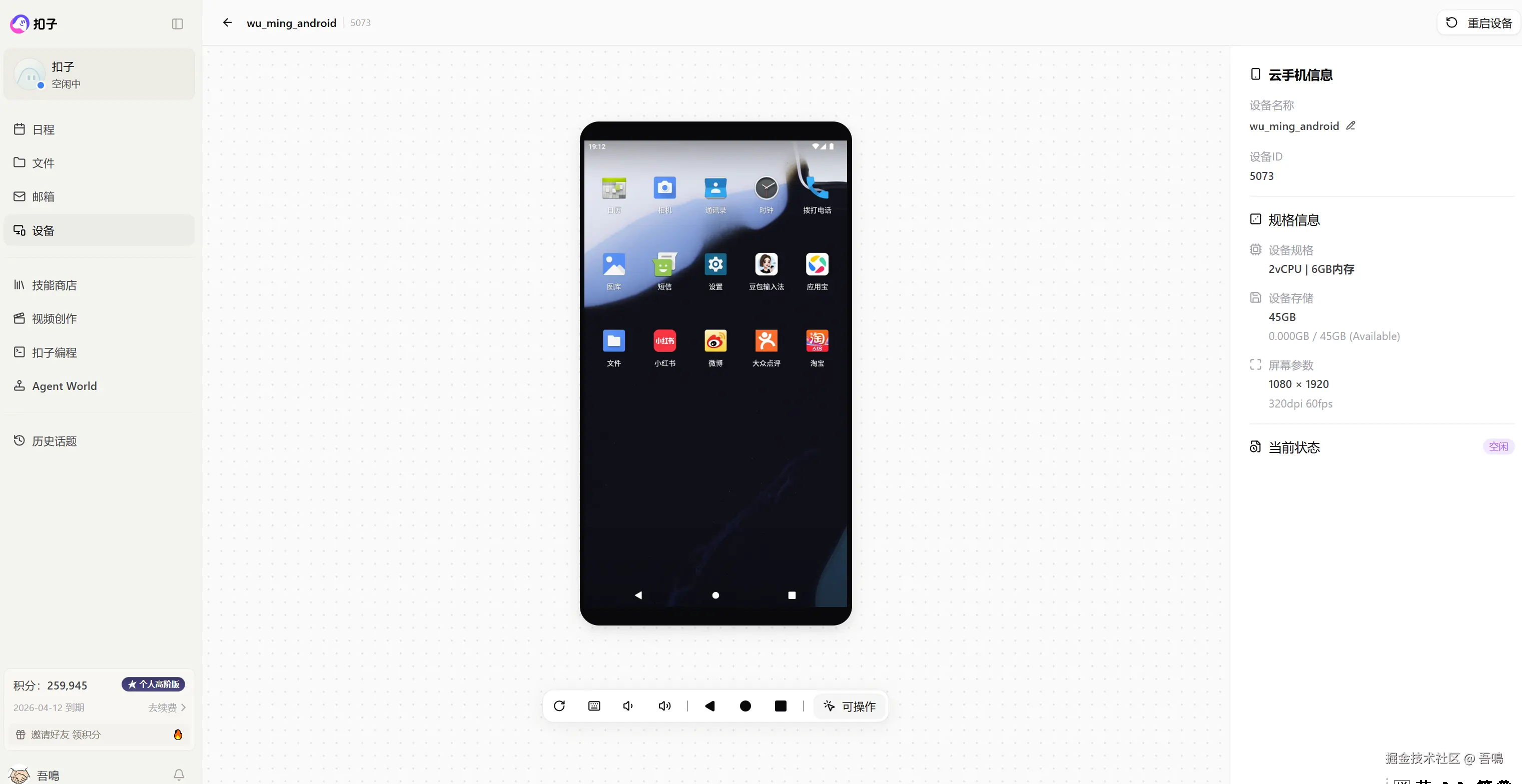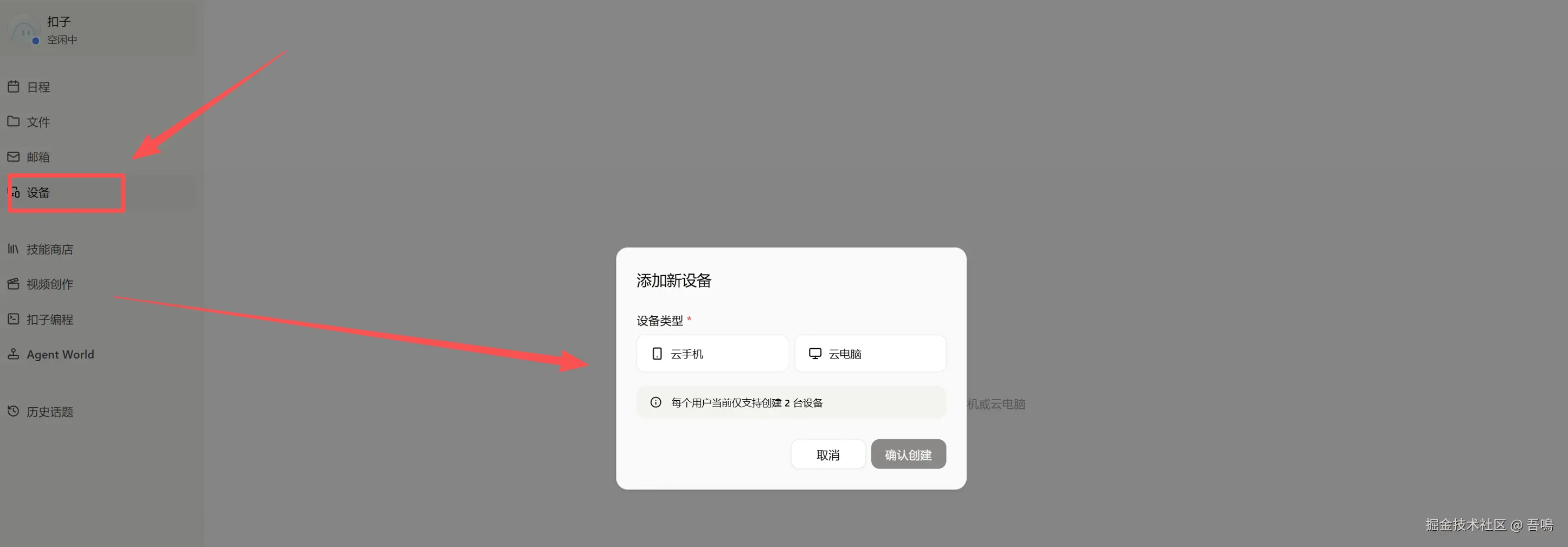 扣子2.5这次升级,直接支持在扣子上创建云电脑和云手机,只需要在左侧的菜单栏的“设备”菜单,然后选择创建云电脑和云手机即可,当前一人只能拥有两台设备。