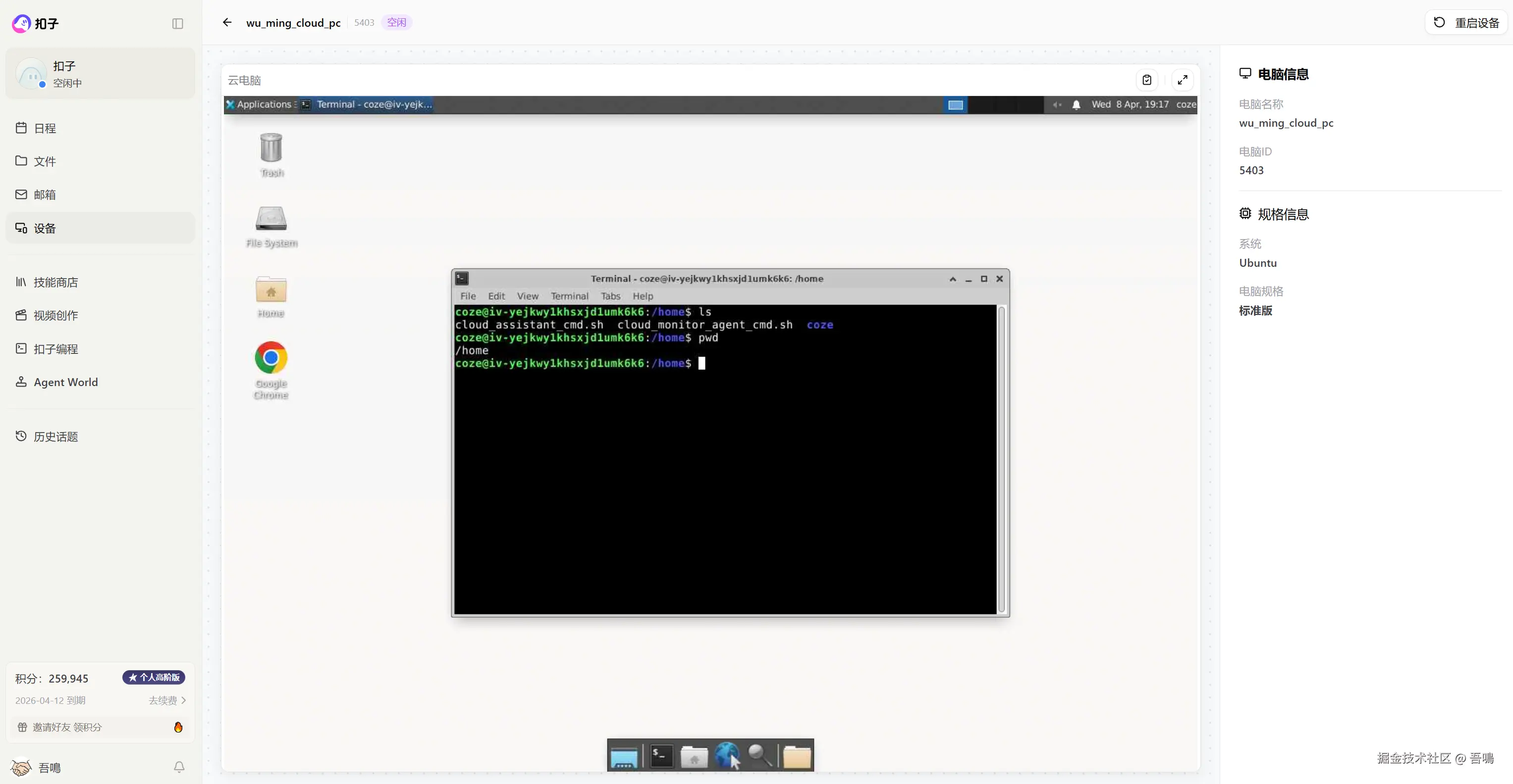 云电脑的操作和云手机的类似,云电脑的系统是Ubuntu的。