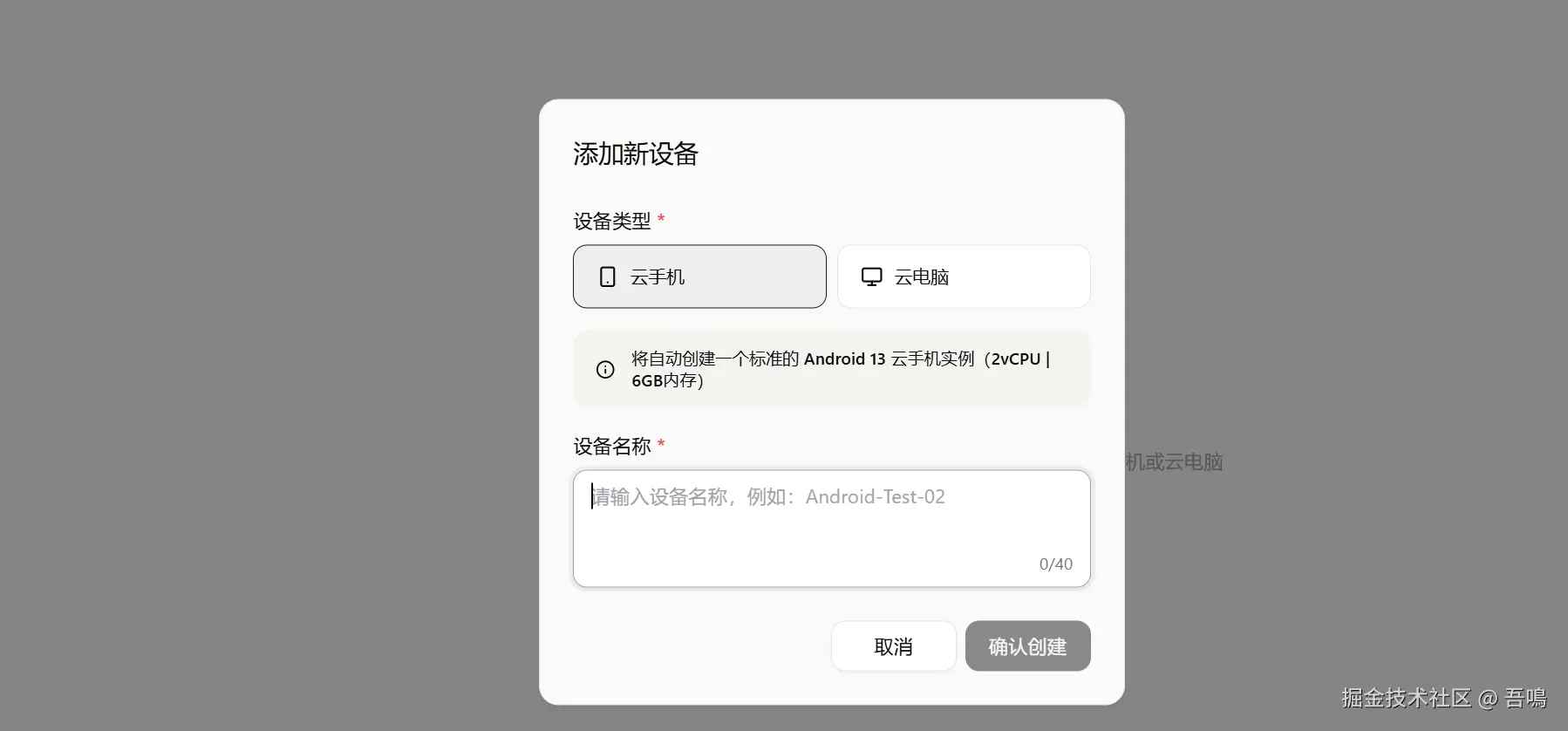 创建云手机的时候,只需要输入对应的设备名称便可以创建出来云手机,操作系统是Android 13,规格是2核,内存是6GB。