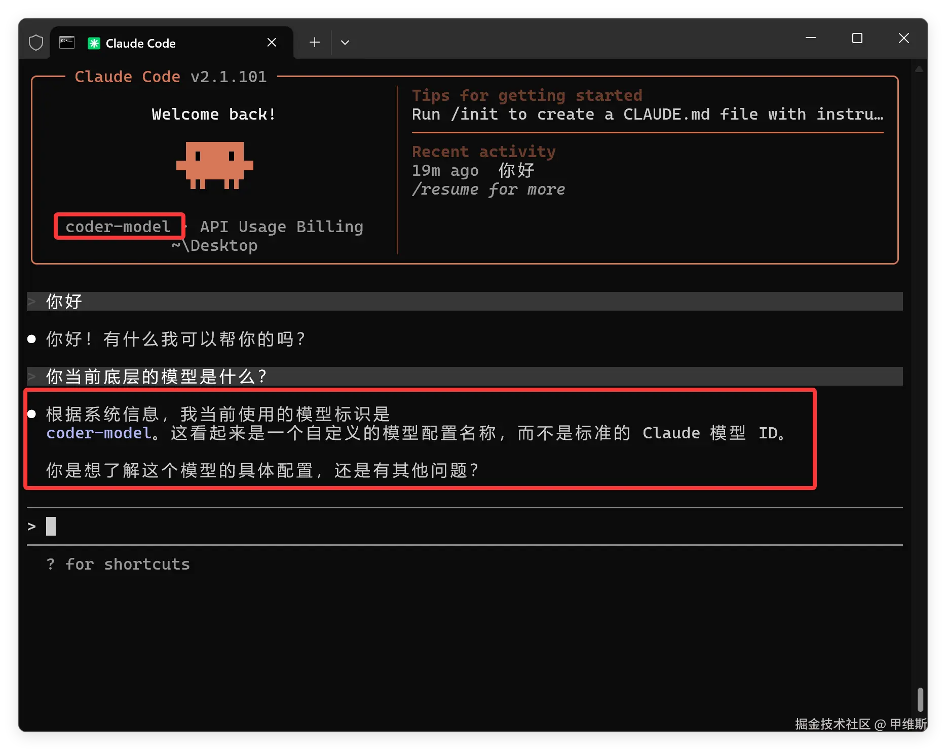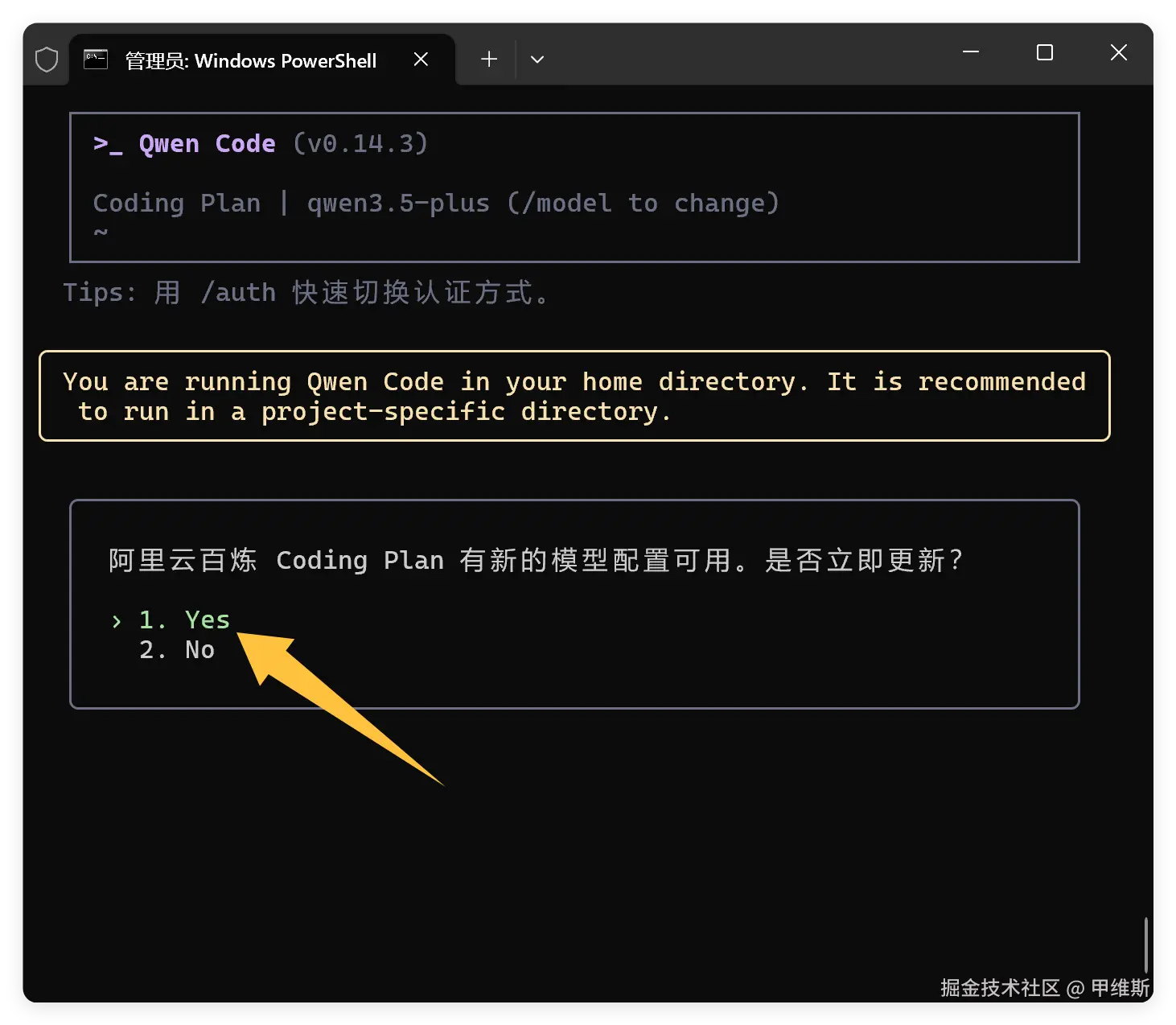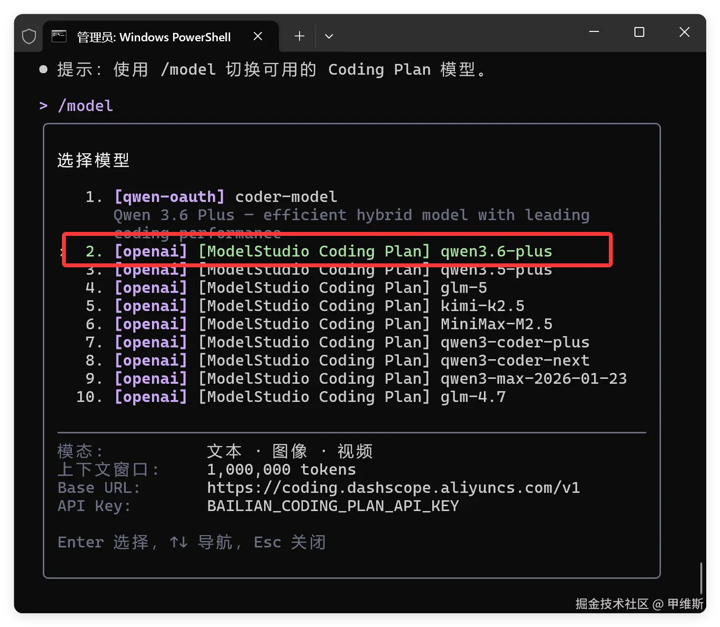 可以看到支持的模型只有一个,叫 coder-model。当前其实就是 Qwen3.6 Plus。
