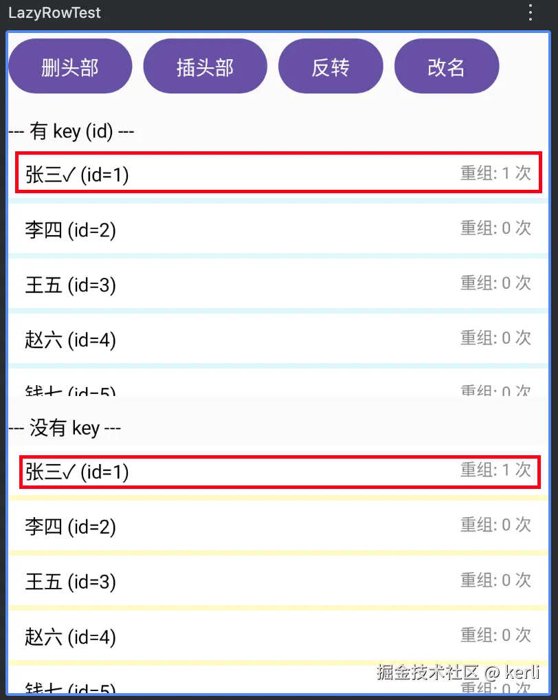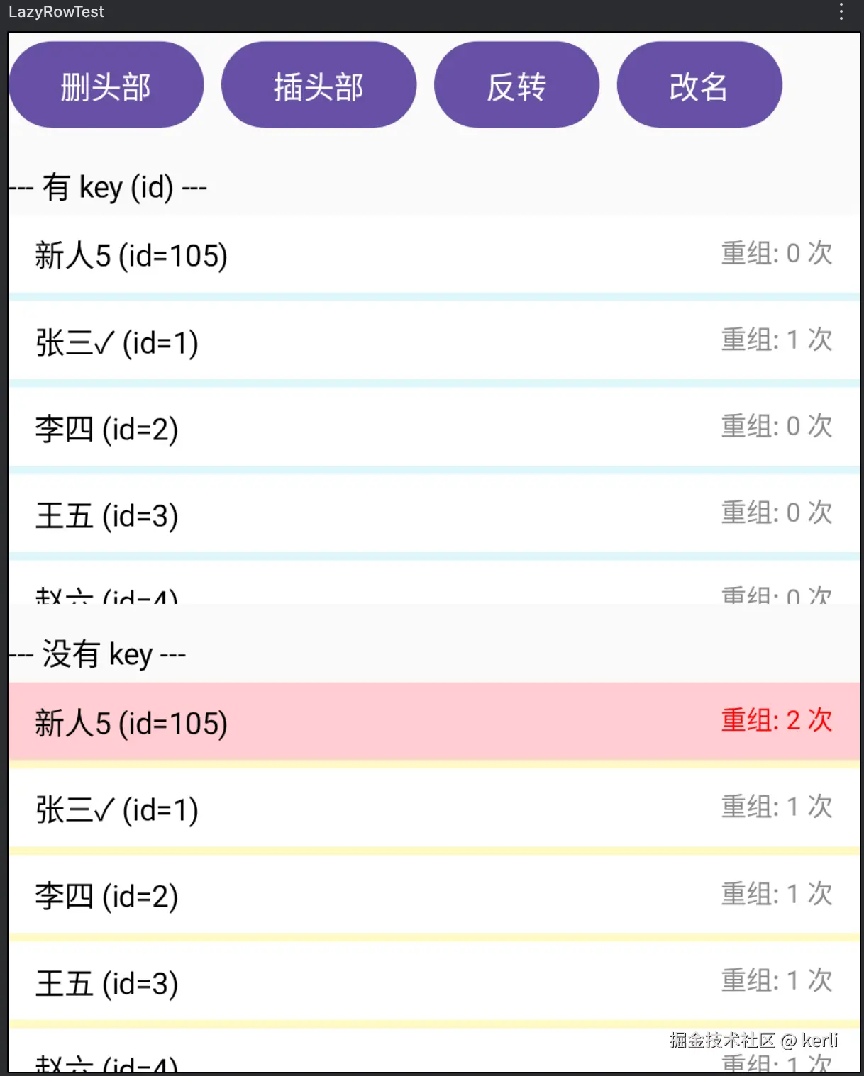 - 列表数据变了,LazyColumn 重新遍历所有 item,调用 key lambda 生成新的 key 列表: