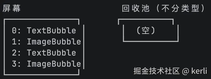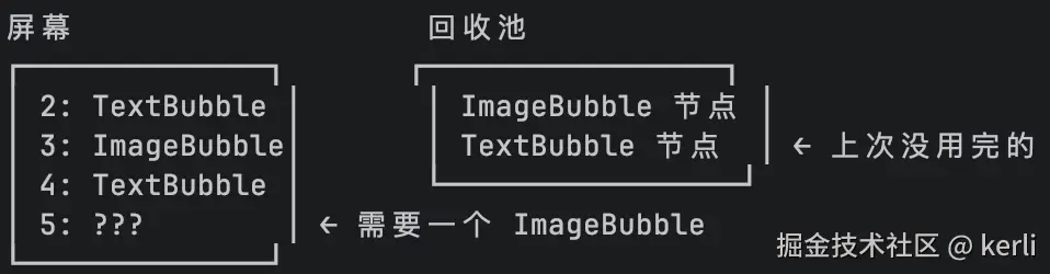 运气差:池里先进先出,拿到的是 TextBubble 节点 → 结构不匹配 → 整个 composition 要拆掉重建 → 慢