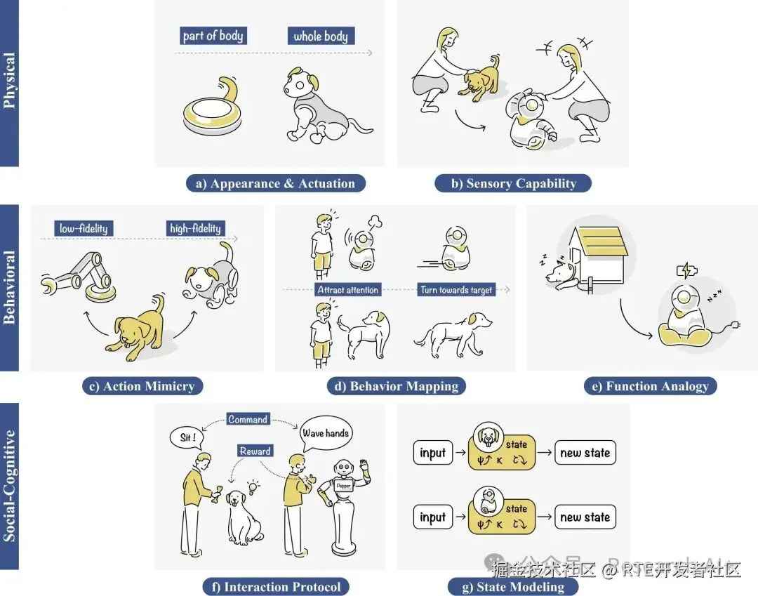 定义了记录(传感器客观保留)、描述(模式提取与归纳)与阐释(社会意义与任务映射)三个数据处理层次,优化了多模态动物行为数据的利用率。基于 44 个学术及商业案例(如情感表达、学习适应机制等),提炼出针对机器人日常活动与社交互动的具体实现策略。