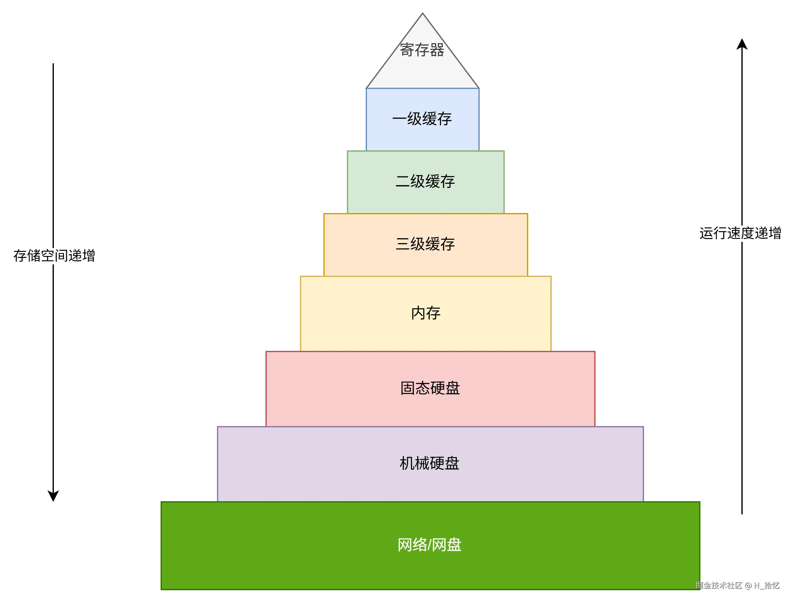 如果将计算机的存储媒介中的处理性能与容量做一个对比.则会出现如图所示的金字塔模型.