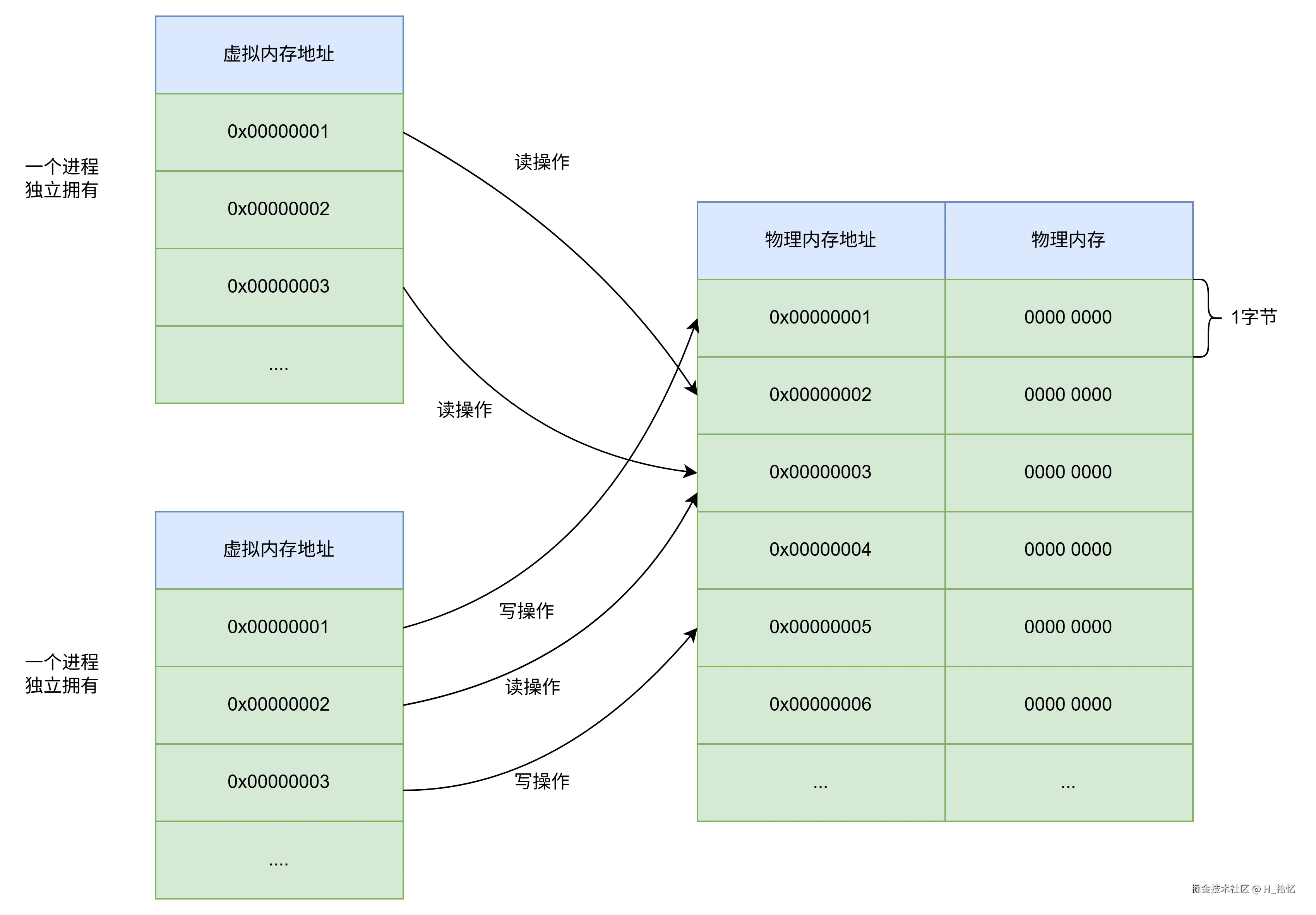 如果一个内存几乎都是被读取的.则可能多个进程共享同一块物理内存.但是它们各自的虚拟内存是不同的.当然这个共享不是永久的.当其中有一个进程对这个内存发生写操作时.就会复制一份.执行写操作的进程就会将虚拟内存地址映射到新的物理内存地址上.
