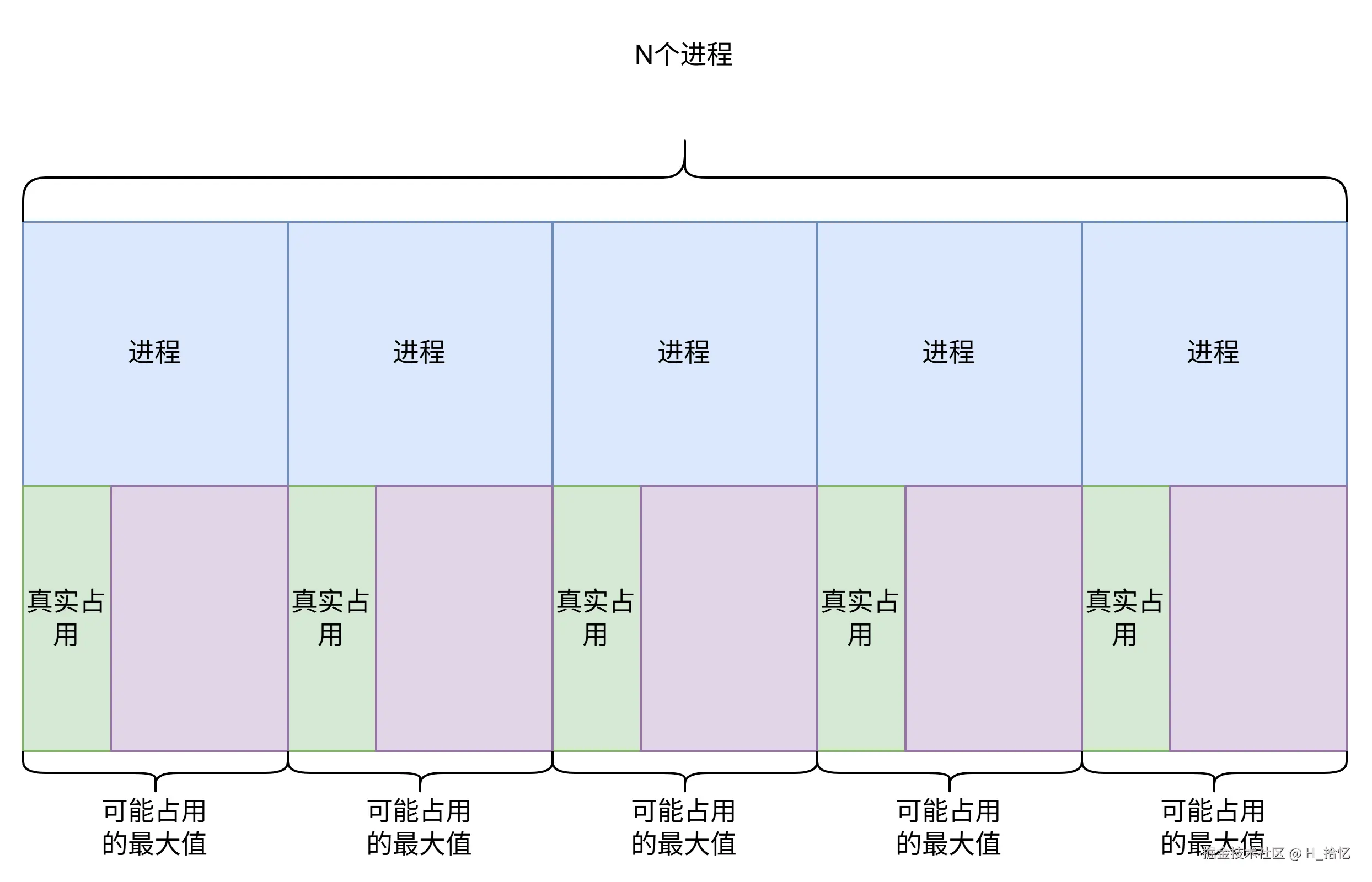 一个操作系统是不可能运行一个程序的.这个大数组物理内存势必要被多个程序分成多份.供每个程序使用.但程序是活的.一个程序可能一会需要1MB内存.一会又需要1GB的内存.操作系统只能取这个程序允许的最大内存极限分配给这个进程.但这样会导致每个进程都会多要去一部分内存.而这些多要的内存却大概率不会被使用.如图所示.