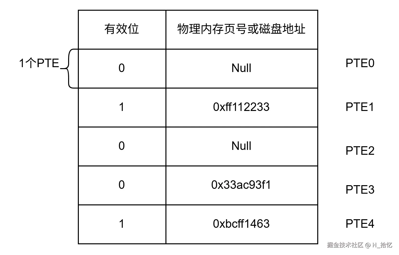 虚拟内存到物理内存的映射关系的存储结构类似上图中的页表记录.实则是一个数组.这里需要注意的是.页是一次读取的内存单元.但是真正到虚拟内存寻址的是PTE.也就是页表中的一个元素.PTE的大致内部结构如图所示.