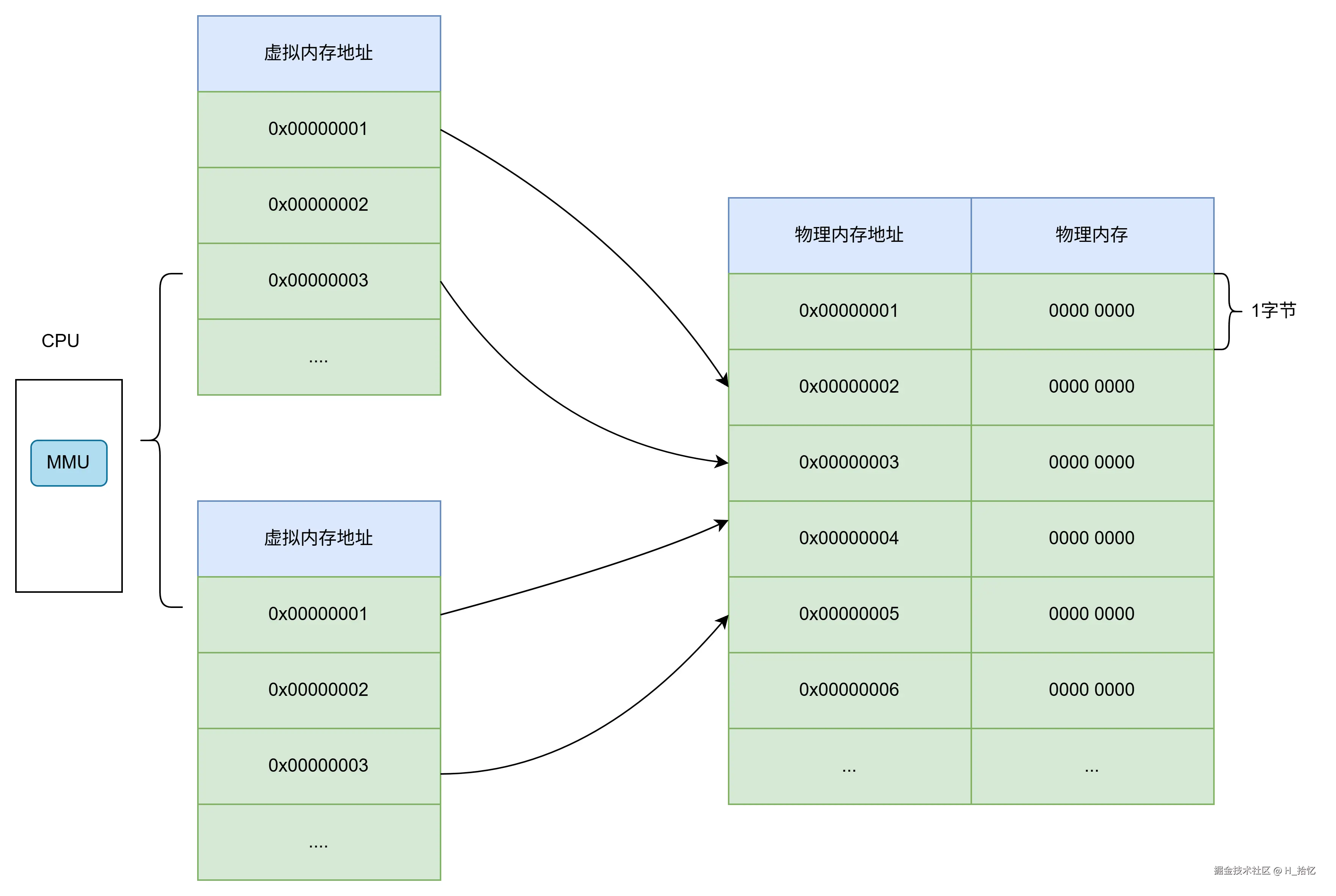 假设使用固定匹配地址逻辑做映射.可能会出现很多虚拟内存映射到同一个物理内存上.如果发现被占用.则会在重新映射.这样对映射地址的寻址代价极大.所以操作系统又加了一层专门用来管理虚拟内存和物理内存映射关系的东西.即MMU(内存管理单元).如图所示.