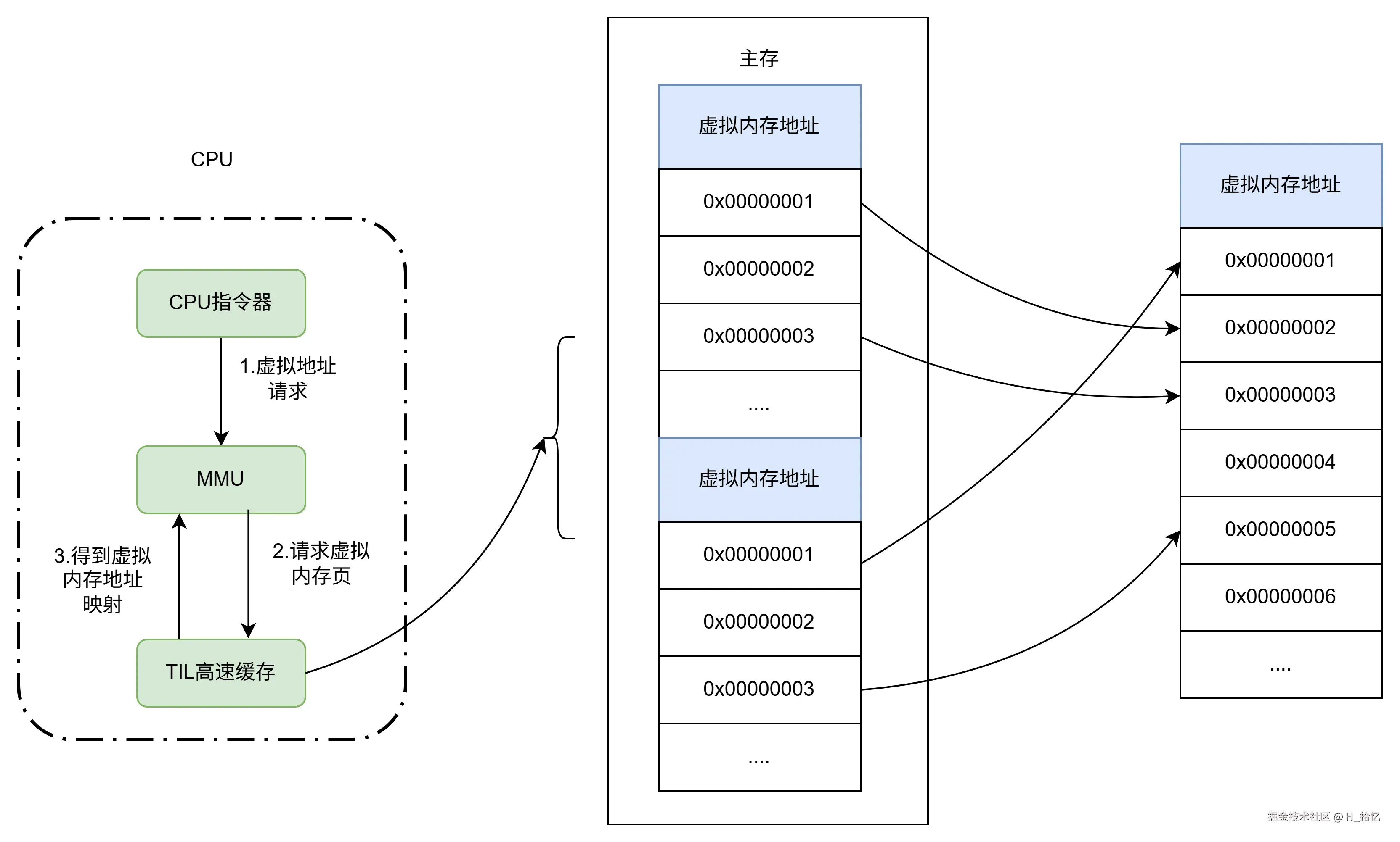 虚拟页表(简称页表)虽然作为虚拟内存与物理内存的映射关系.但是本身也需要存放在某个位置上.所以自身也占用一定的内存.所以页表本身也被操作系统放在物理内存的指定位置.CPU把虚拟地址给MMU.MMU去物理内存中查询页表.得到实际的物理地址.当然MMU不会每次都去查询.它自己也有一份缓存.叫作Translation Lookaside Buffer(TLB).是为了加速地址翻译.CPU MMU TLB的相互关系如下图.