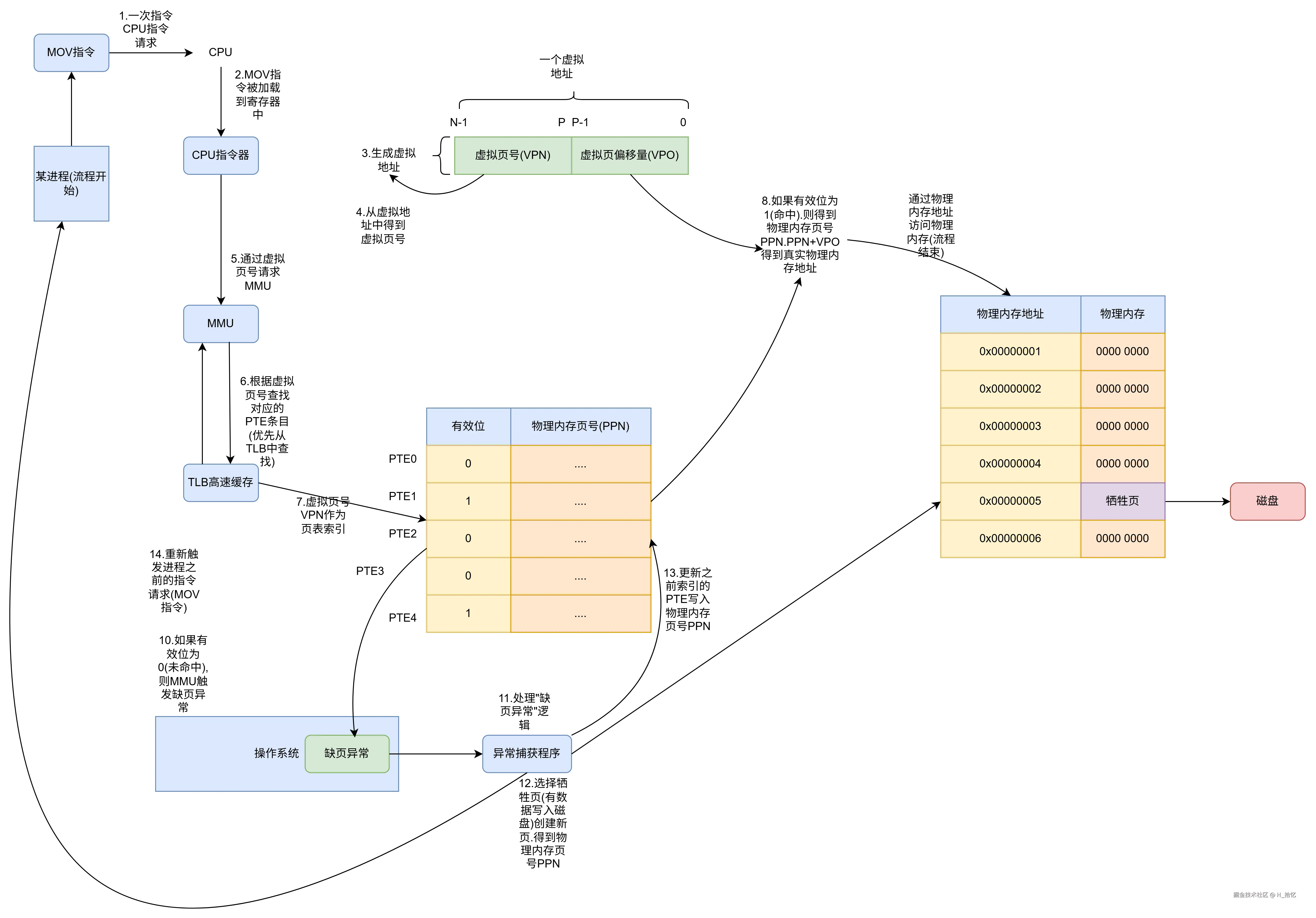 14).缺页处理程序再次返回原来的进程.并且再次执行缺页指令.CPU重新将虚拟地址发给MMU.此时虚拟页已经存在物理内存中.本次一定会命中.通过1-9的步骤.最终将请求的物理内存返给处理器.