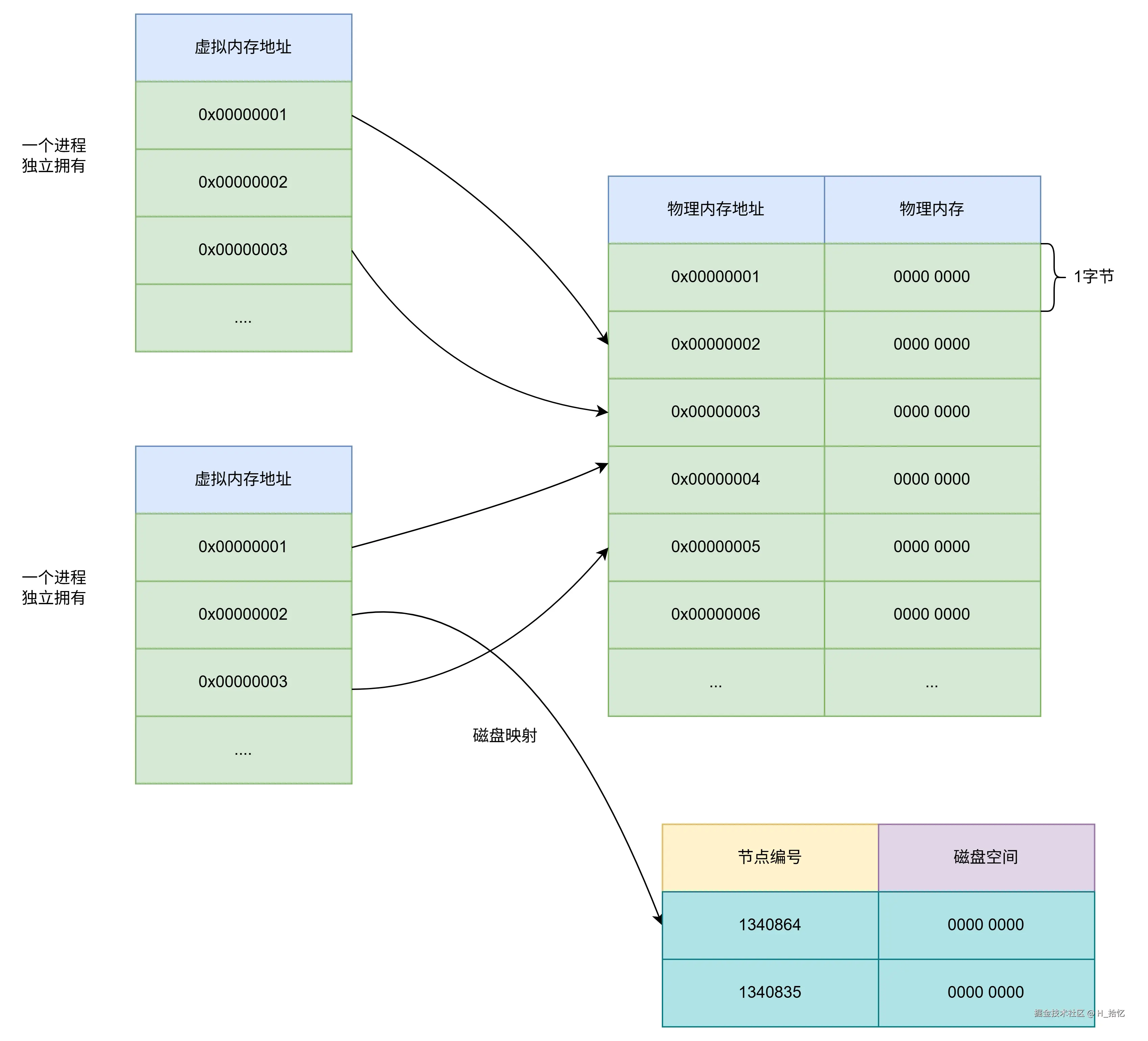 对于1和2两点.上述已经有一定的描述了.其中针对1的最大化.虚拟内存还实现了读时共享写时复制的机制.可以在物理层同一字节的内存地址被多个虚拟内存空间映射.如图所示.