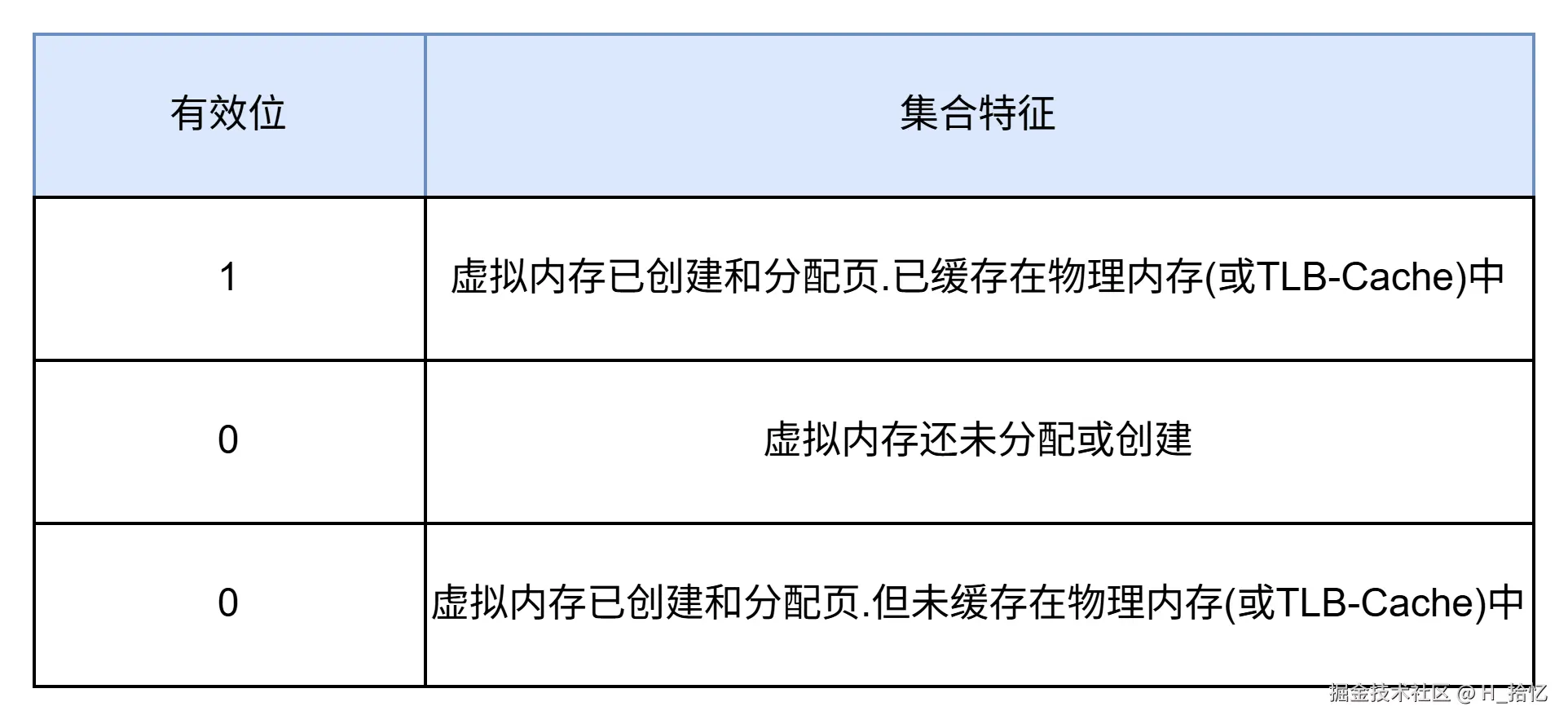 2).有效位位0.表示虚拟页未被创建且没有占用内存(或者CPU高速缓存了TLB-Cache).或者表示已经创建虚拟页.但是没有存到内存(或者CPU高速缓存TLB-Cache)中.