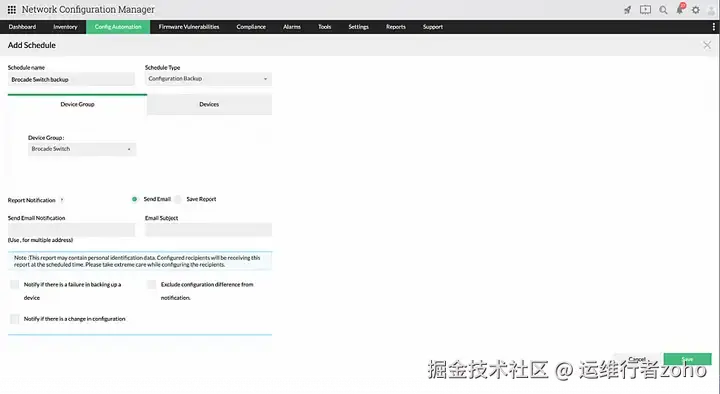 配置备份至关重要,因为在不可预见的网络中断时,它们价值非凡。有了备份,您可以在几分钟内快速恢复网络,而无需花费宝贵时间排查根本问题。借助此附加组件,您可以通过三种方式进行备份:批量/即时备份、计划备份和自动备份(基于变更检测)。