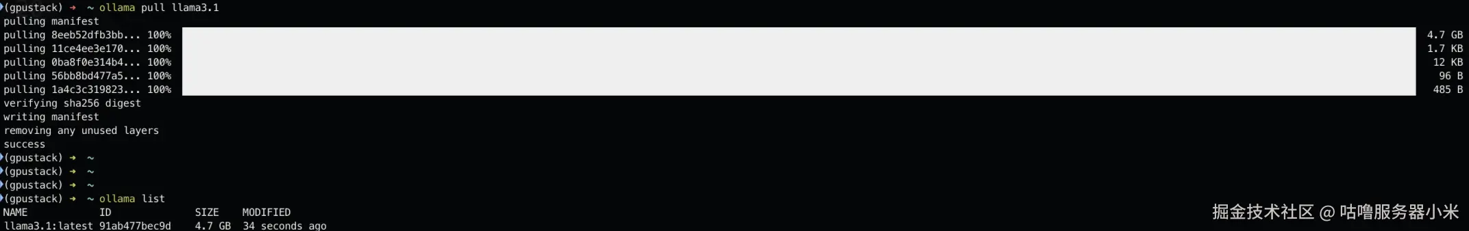 运行 Ollama,然后打开命令行,通过 Ollama 命令下载 llama3.1 模型:ollama pull llama3.1