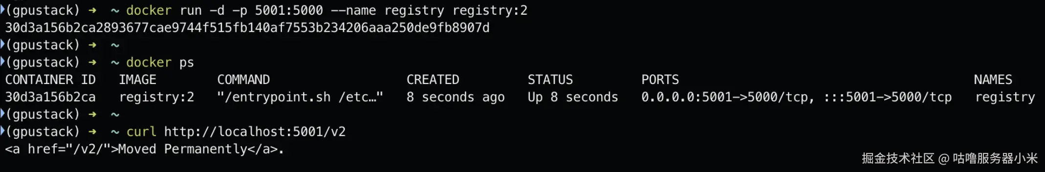 访问 Docker Registry 端点验证 Registry 服务正常:curl http://localhost:5001/v2