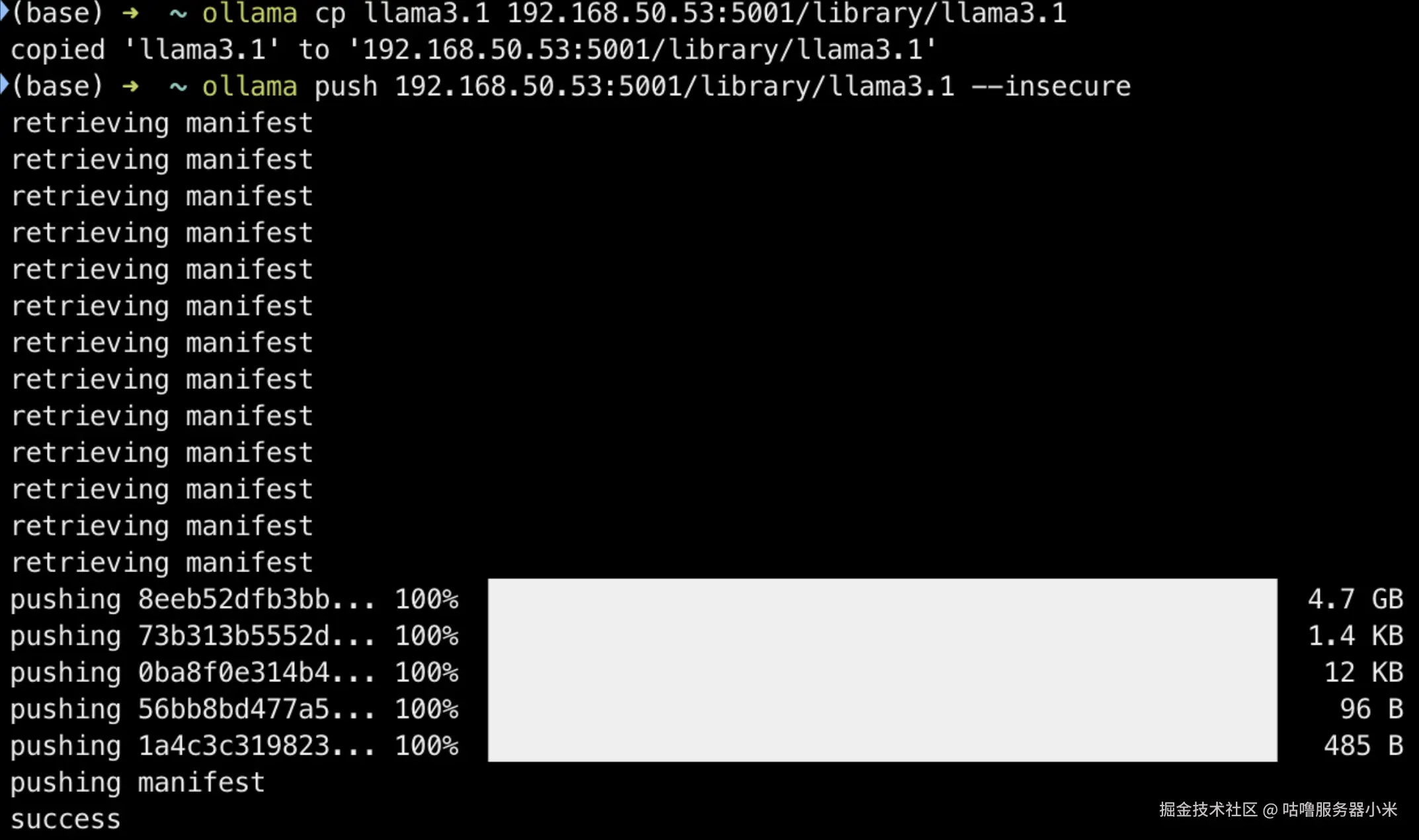 将模型镜像推送到 Docker Registry :ollama push 192.168.50.53:5001/library/llama3.1 --insecure