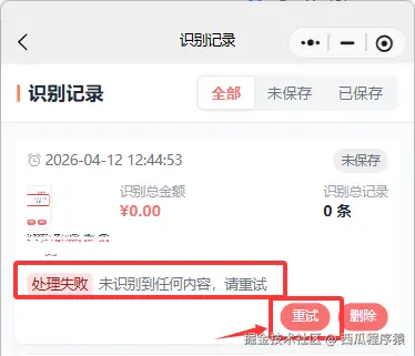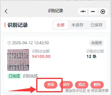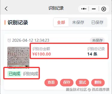 等待片刻后,重新进入此页面或者切换状态(全部、未保存、已保存)刷新,可以看到任务状态已经为 [已完成] 了,然后系统自动计算出识别总条数、识别总金额(注意:如果识别结果不理想,可以点击【重试】按钮重新提交工单,系统会重新进行识别,需要注意点击重试会清空之前的识别记录)。