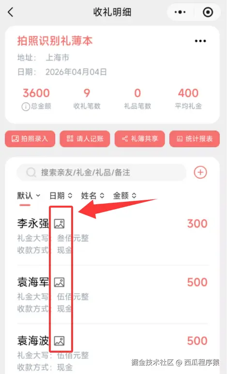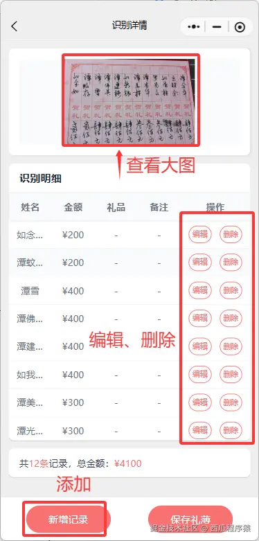保存后可以在记了么小程序端在礼薄本-收礼明细,从识别记录保存的礼薄可以点击查看大图,方便主家核对。